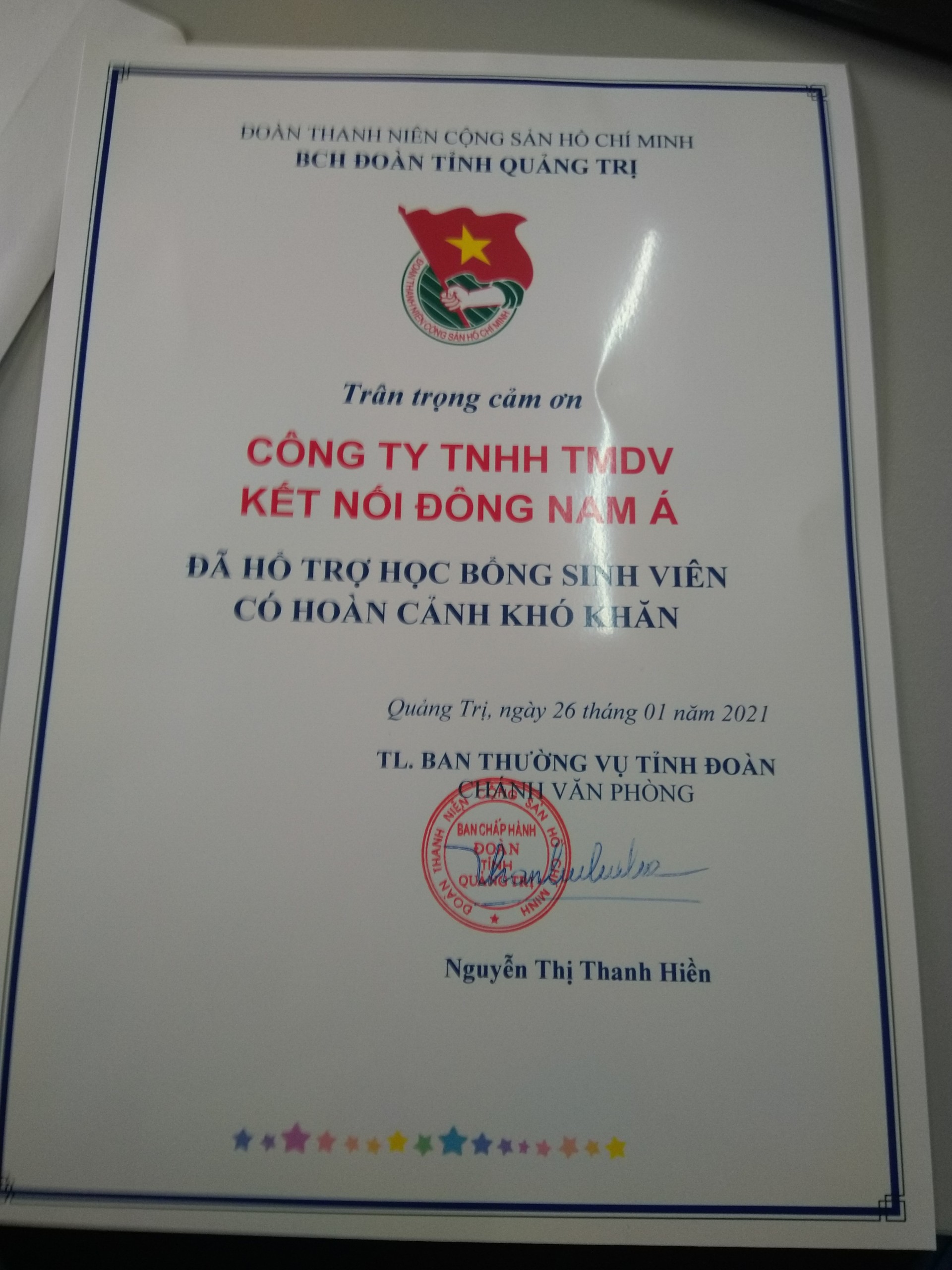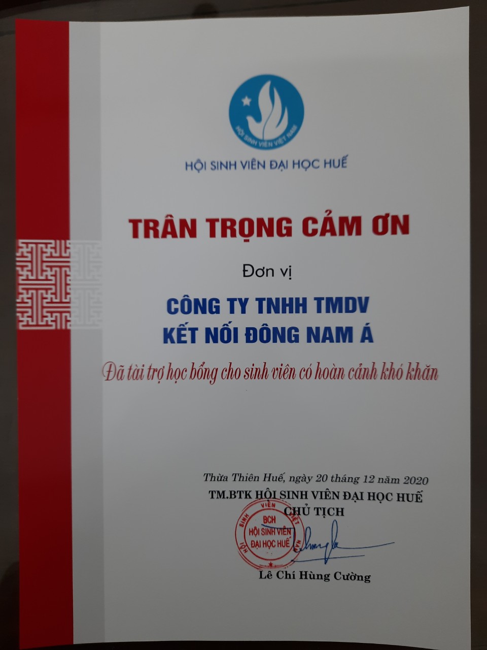 TVC Thailand and ASEAN CONNECT Co., Ltd., Vietnam, granted scholarships to students at Hue University and Quang Tri University for their achievements and for mitigating flood impacts on their families in December 2020.