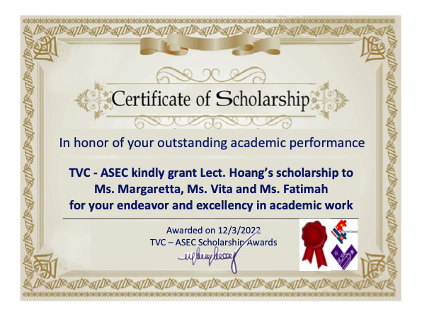 TVC and ASEAN CONNECT Ltd. granted scholarships to Indonesian students at Surabaya University, eastern Indonesia, for their journal publication and scholarship awards from Lect. Hoang in February 2022.