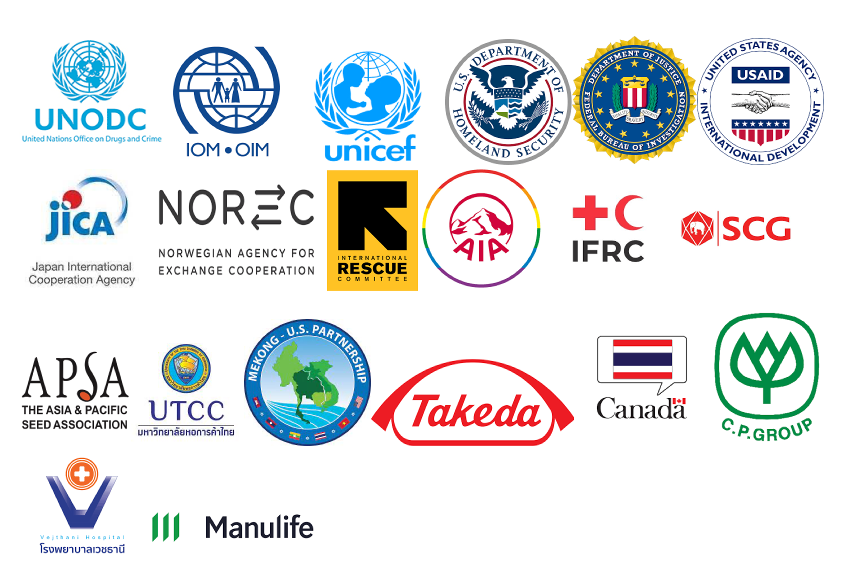 United Nations on Drugs and Crime, the American Bar Association, the US FBI Agency, IOM, UNICEF, IFRC, ASPA, ISTA, Mekong US Partnership, the US Department of Agriculture, JICA Thailand, Vejathani Hospital, the Ministry of Social Development and Human Security, Central Group, CP Group, SCG Group, UTCC University, NOREC Norway, AIA Insurance, Manulife International, Takeda Ltd, Sapiens International, Castro, AstraZeneca, Vision Ventures, WHA, UN Women, Castrol…
