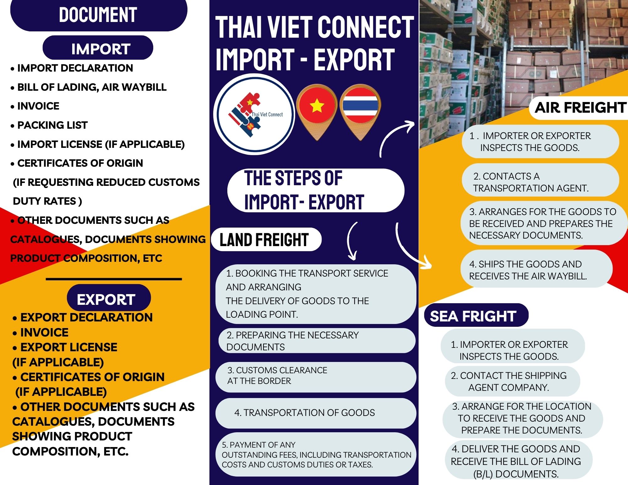 - TRADE, TRANSPORT & TRAVEL: TVC provides trade facilitation, import-export services, transportation, and travel services between Thailand, Vietnam, Laos, Cambodia, Indonesia, the Philippines, and other countries, including land transport, sea freight, air cargo, fulfillment, and rental services. Read more