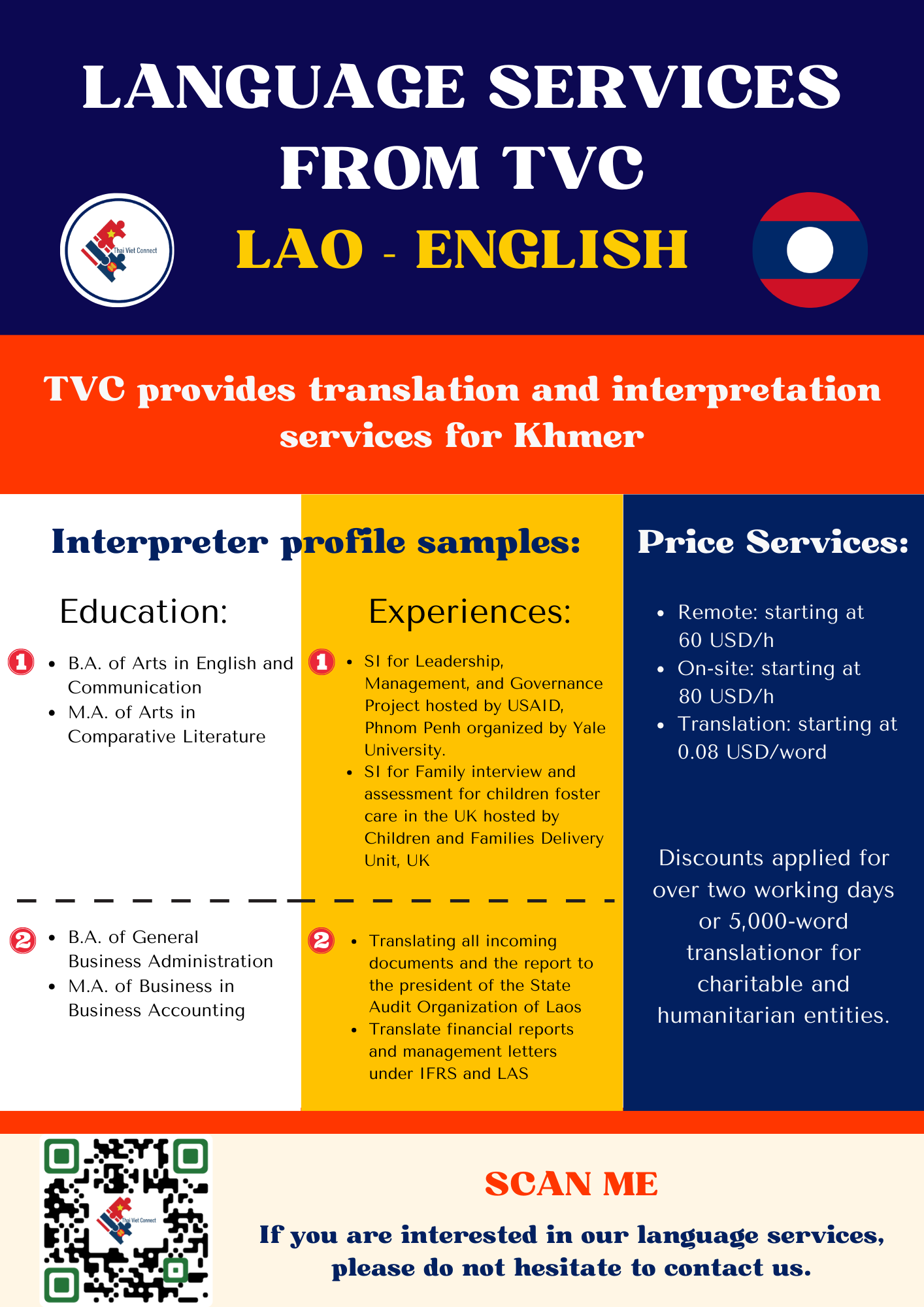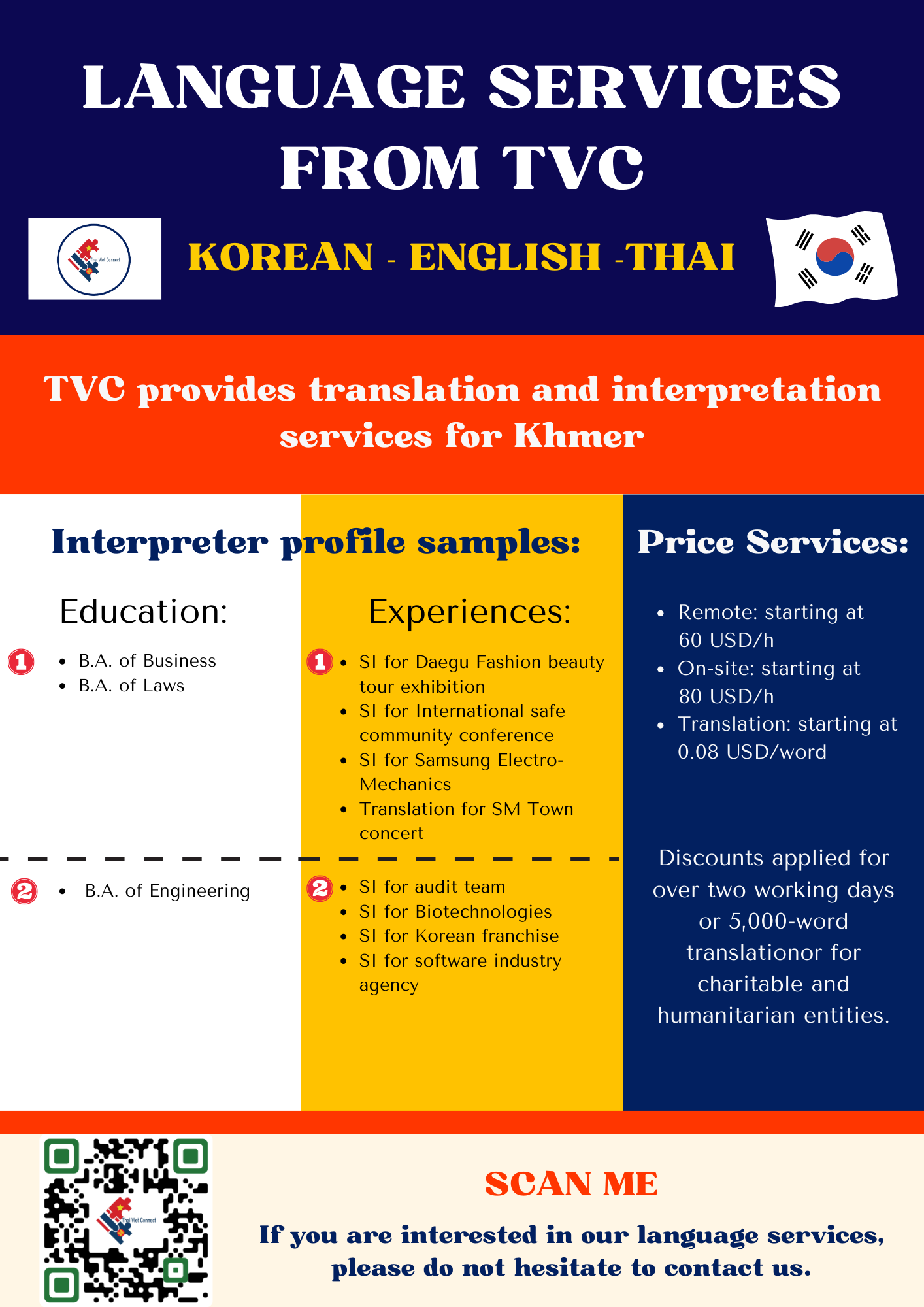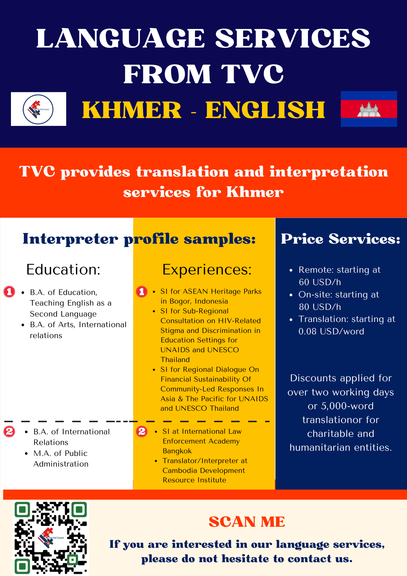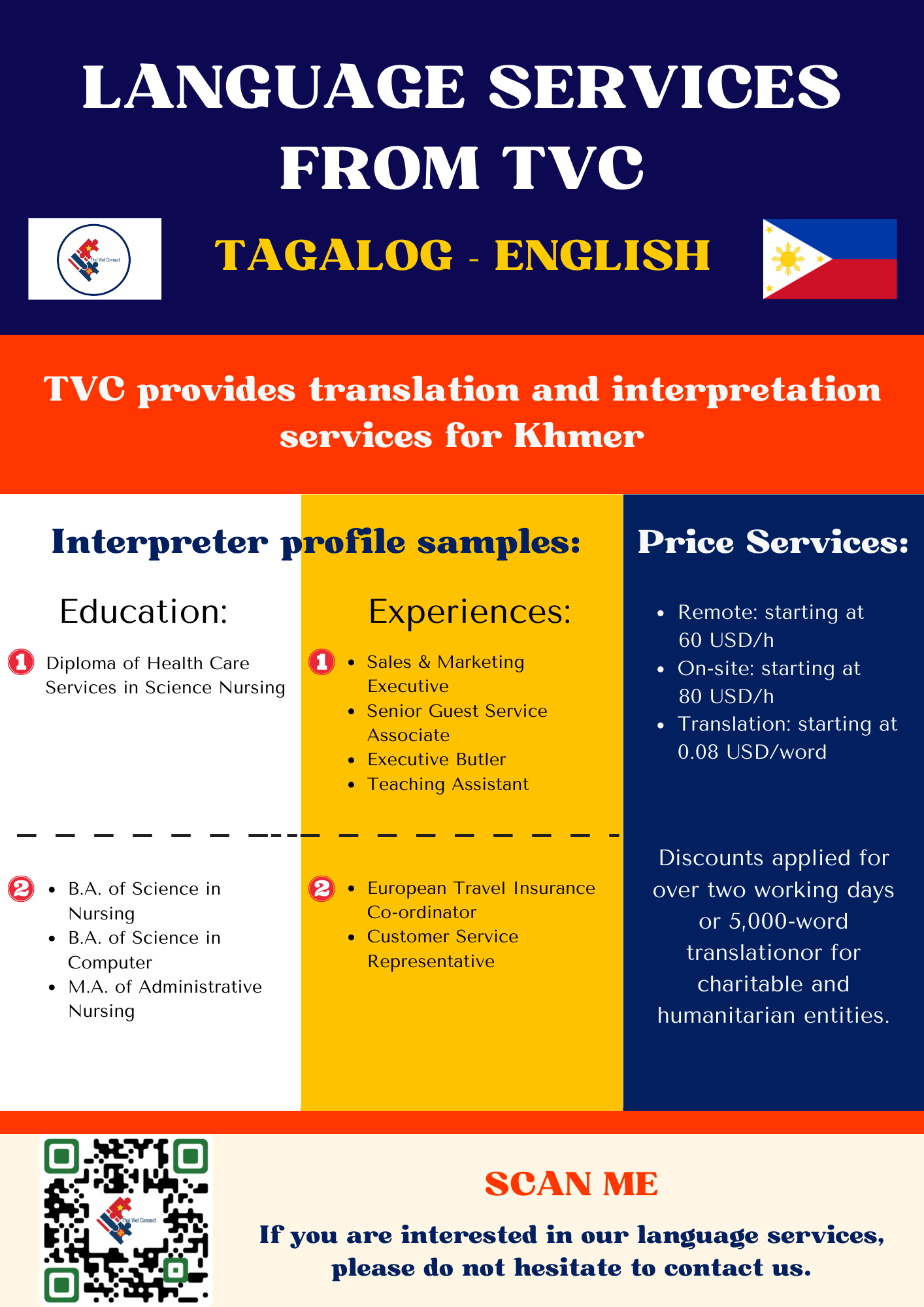 - LANGUAGE AND NOTARY: TVC provides high-quality interpretation, translation and notary and legalization services between regional languages in Southeast Asia with our young and talented native interpreters, translators and certified consultants including Thai, Vietnamese, Hmong-Jarai- Ede – Cham – Bana, Bahasa Indonesia, Malaysia, Jawi, Lao, Khmer, Burmese, Rohingya, Karen, Tagalog, Tetum, Chinese and Cantonese, Japanese, Korean and other languages such as Spanish, Portuguese, Arabic, Urdu, Bengali, Tamil, Hindi, Pashto, Farsi, Russian, French, Somali. Read more