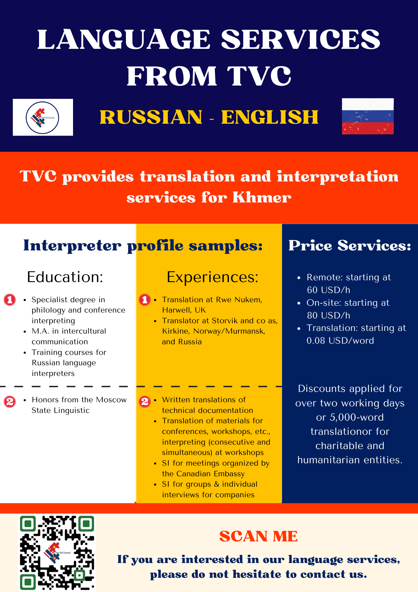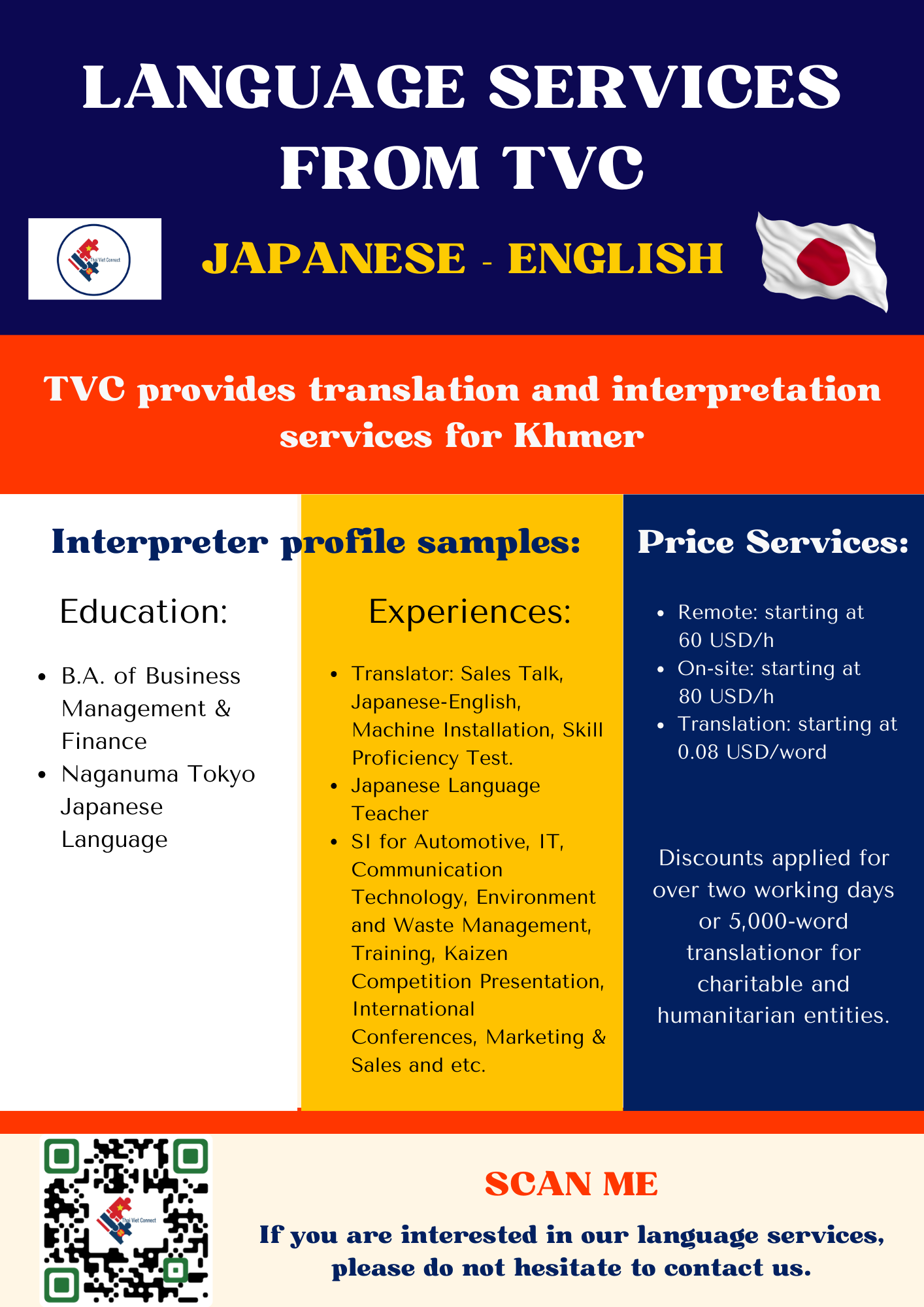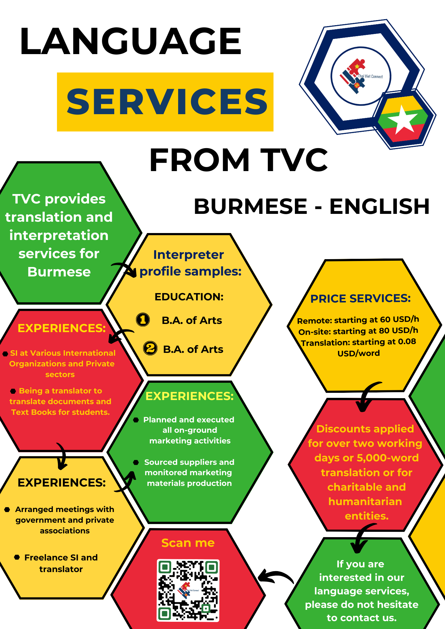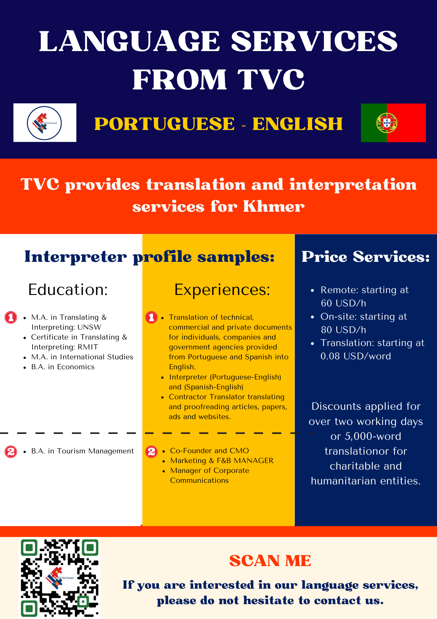 - LANGUAGE AND NOTARY: TVC provides high-quality interpretation, translation and notary and legalization services between regional languages in Southeast Asia with our young and talented native interpreters, translators and certified consultants including Thai, Vietnamese, Hmong-Jarai- Ede – Cham – Bana, Bahasa Indonesia, Malaysia, Jawi, Lao, Khmer, Burmese, Rohingya, Karen, Tagalog, Tetum, Chinese and Cantonese, Japanese, Korean and other languages such as Spanish, Portuguese, Arabic, Urdu, Bengali, Tamil, Hindi, Pashto, Farsi, Russian, French, Somali. Read more