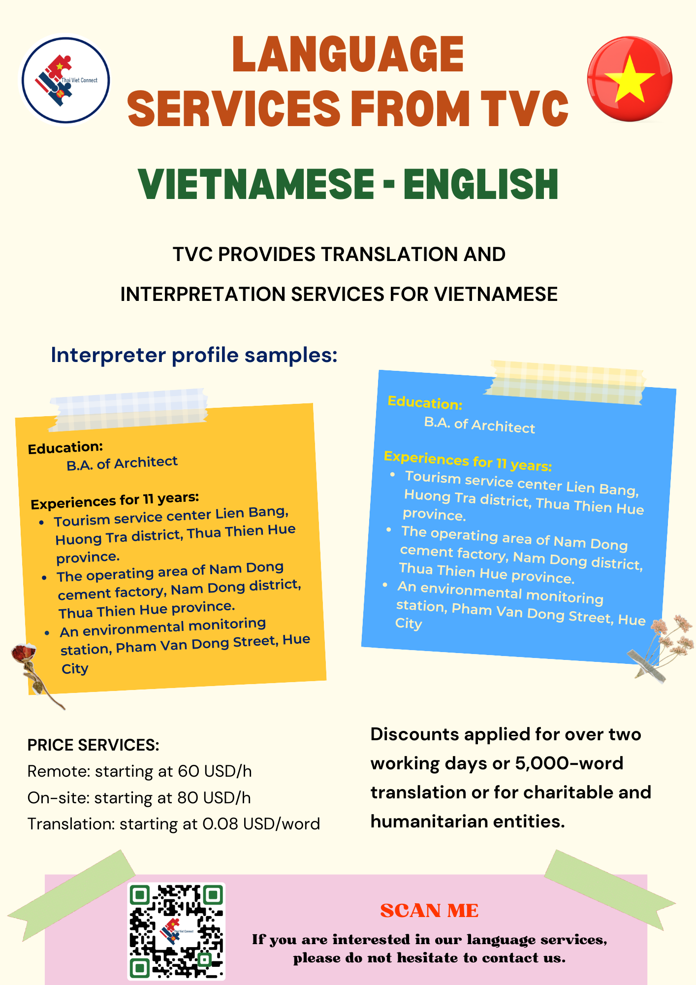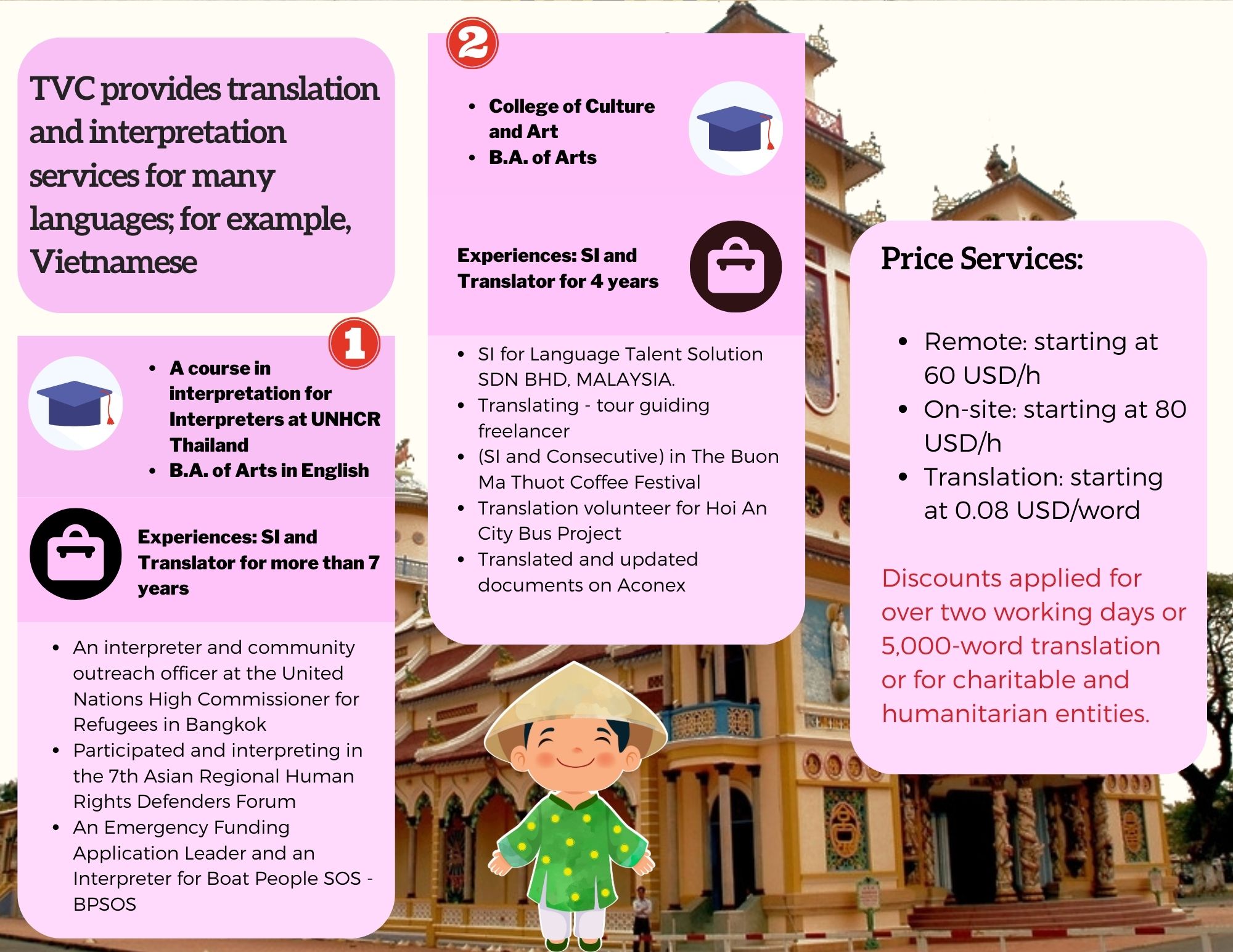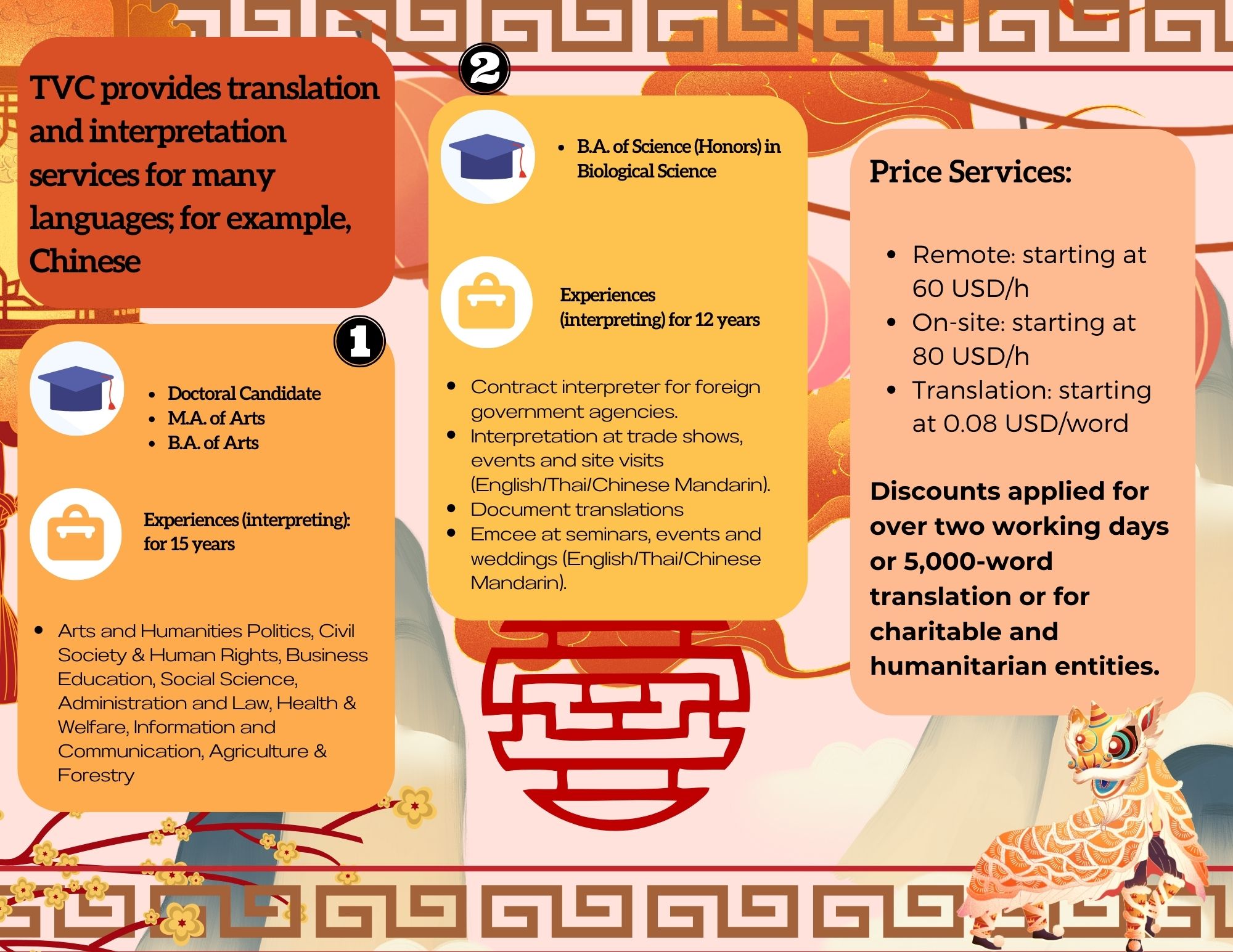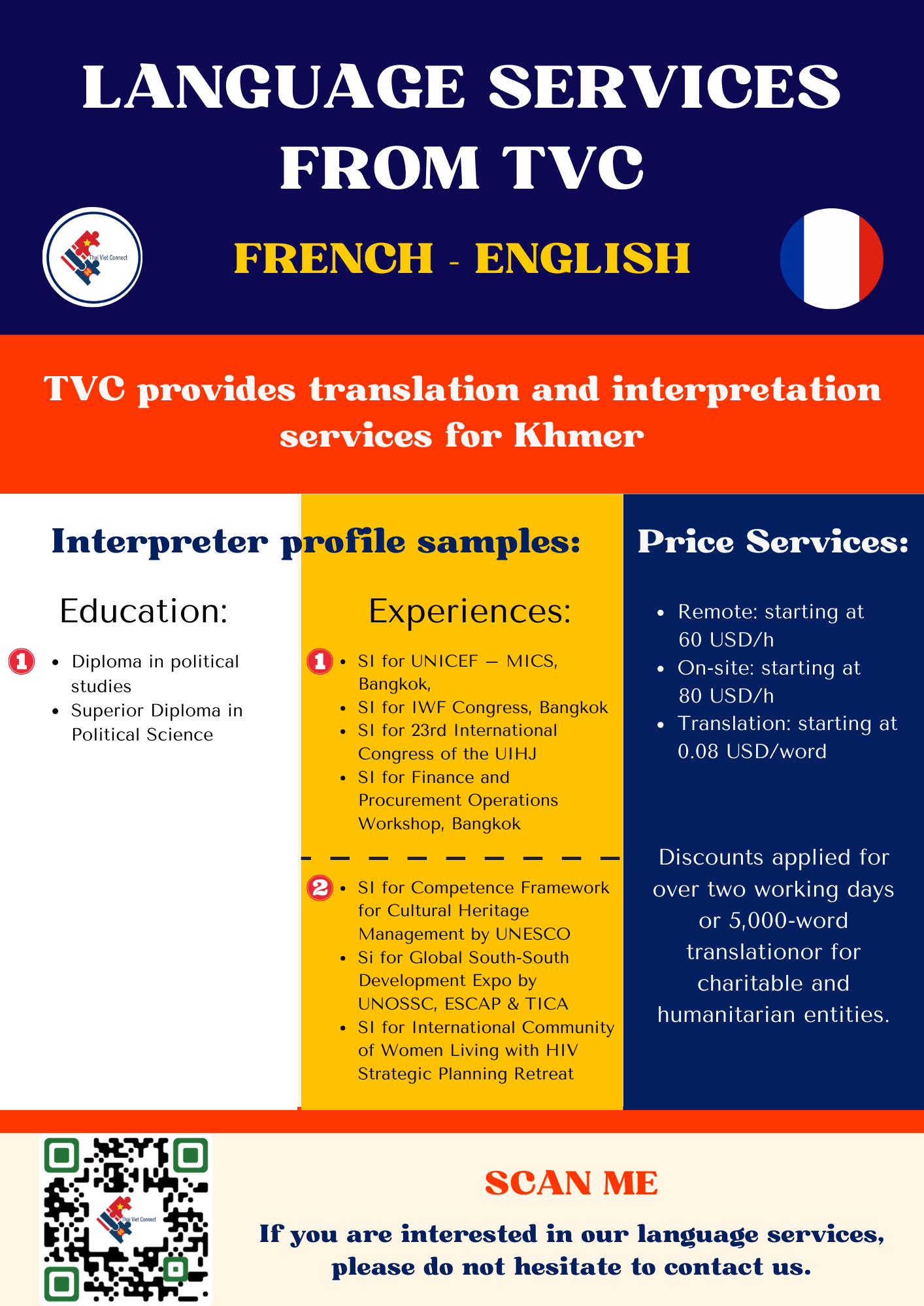 - LANGUAGE AND NOTARY: TVC provides high-quality interpretation, translation and notary and legalization services between regional languages in Southeast Asia with our young and talented native interpreters, translators and certified consultants including Thai, Vietnamese, Hmong-Jarai- Ede – Cham – Bana, Bahasa Indonesia, Malaysia, Jawi, Lao, Khmer, Burmese, Rohingya, Karen, Tagalog, Tetum, Chinese and Cantonese, Japanese, Korean and other languages such as Spanish, Portuguese, Arabic, Urdu, Bengali, Tamil, Hindi, Pashto, Farsi, Russian, French, Somali. Read more
