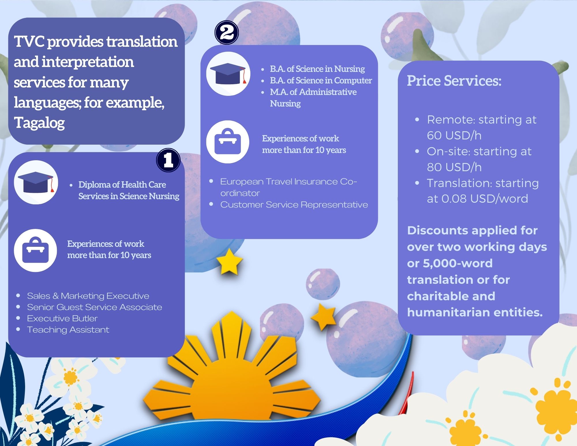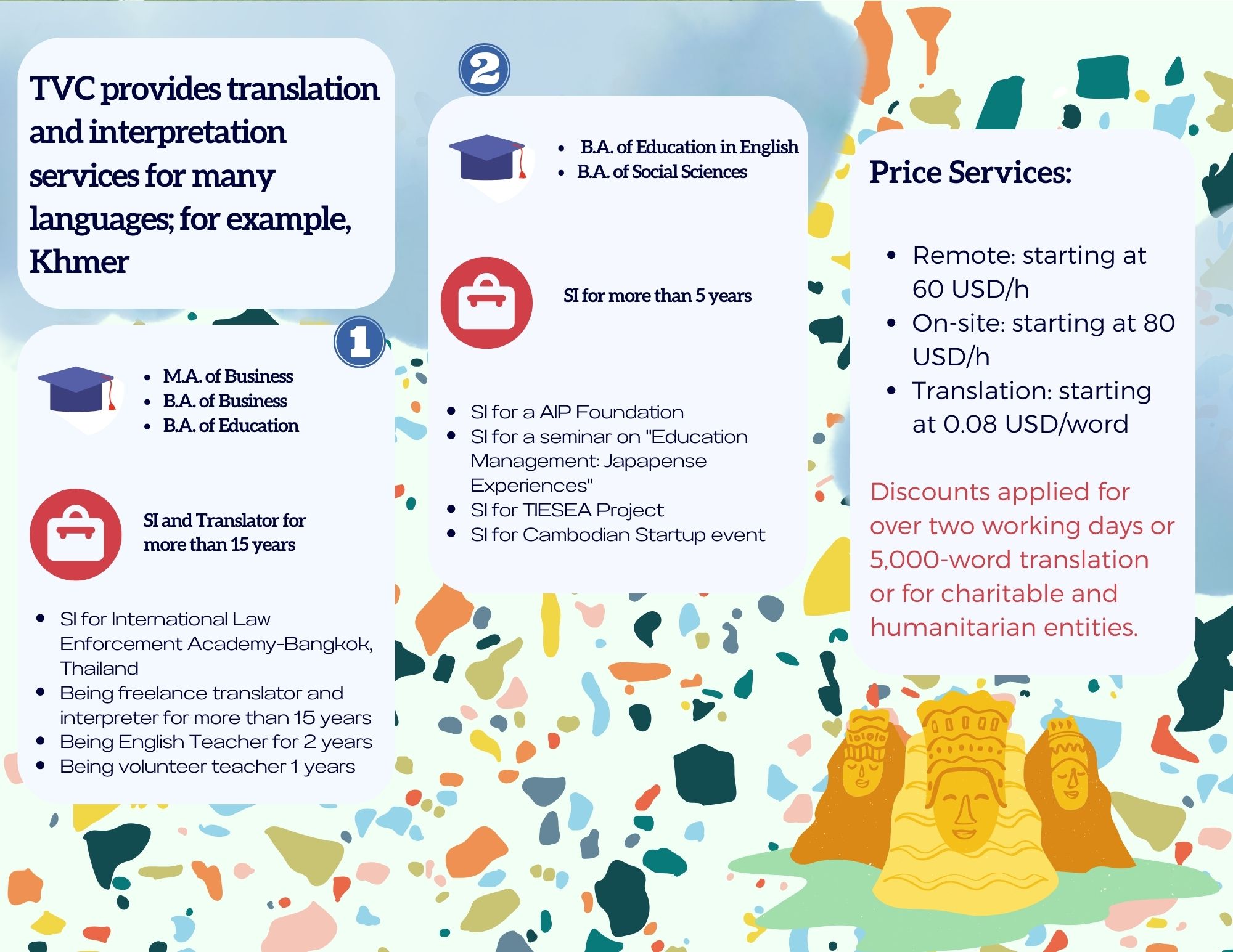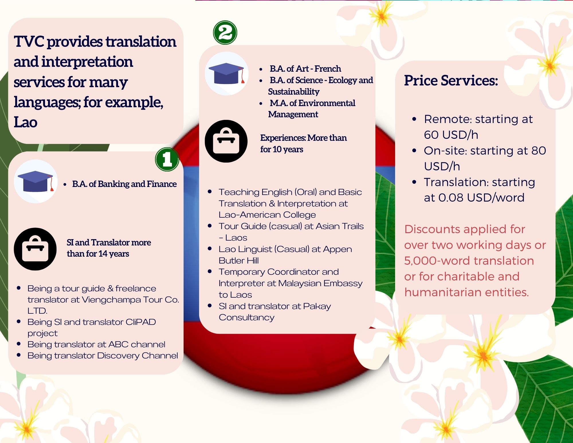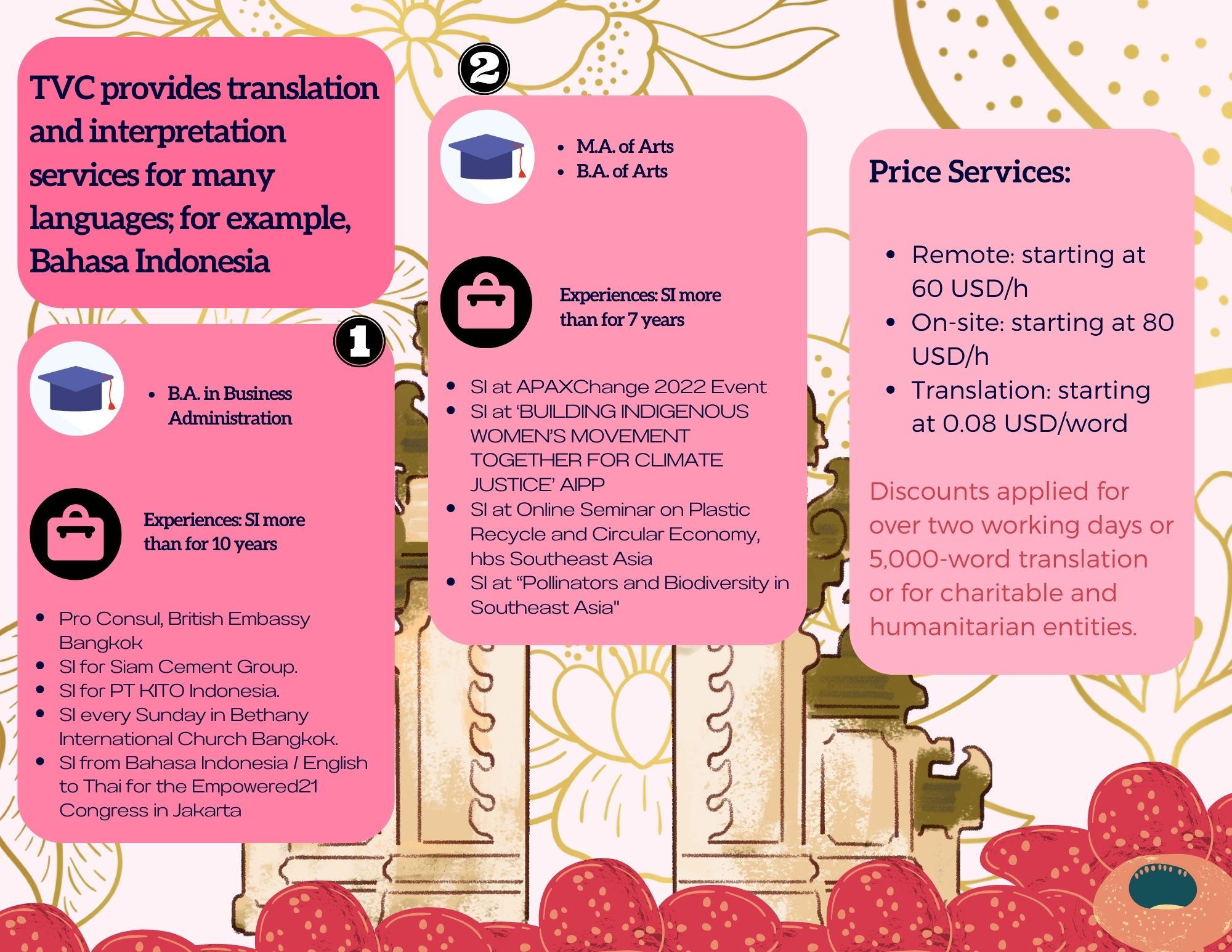 - LANGUAGE AND NOTARY: TVC provides high-quality interpretation, translation and notary and legalization services between regional languages in Southeast Asia with our young and talented native interpreters, translators and certified consultants including Thai, Vietnamese, Hmong-Jarai- Ede – Cham – Bana, Bahasa Indonesia, Malaysia, Jawi, Lao, Khmer, Burmese, Rohingya, Karen, Tagalog, Tetum, Chinese and Cantonese, Japanese, Korean and other languages such as Spanish, Portuguese, Arabic, Urdu, Bengali, Tamil, Hindi, Pashto, Farsi, Russian, French, Somali. Read more