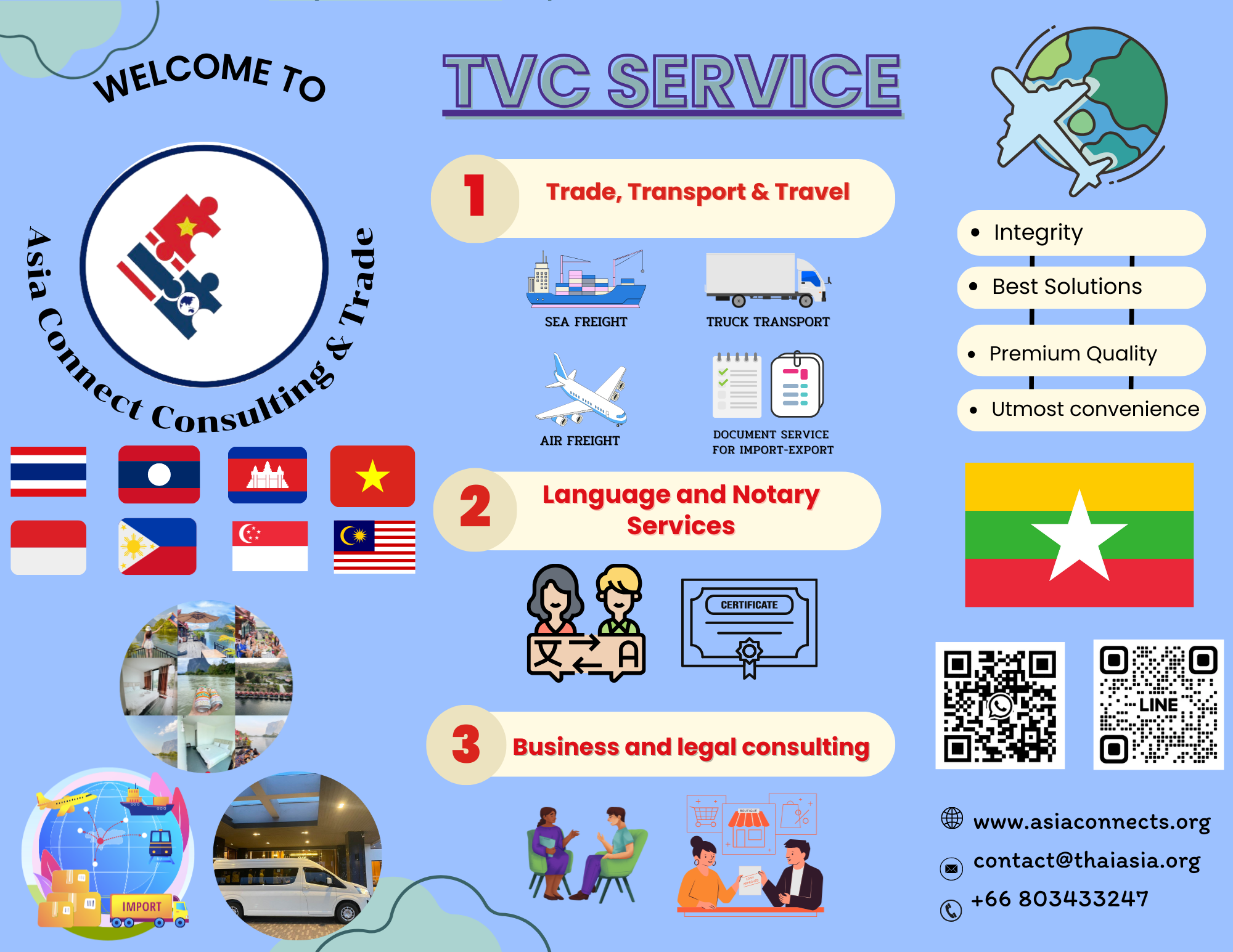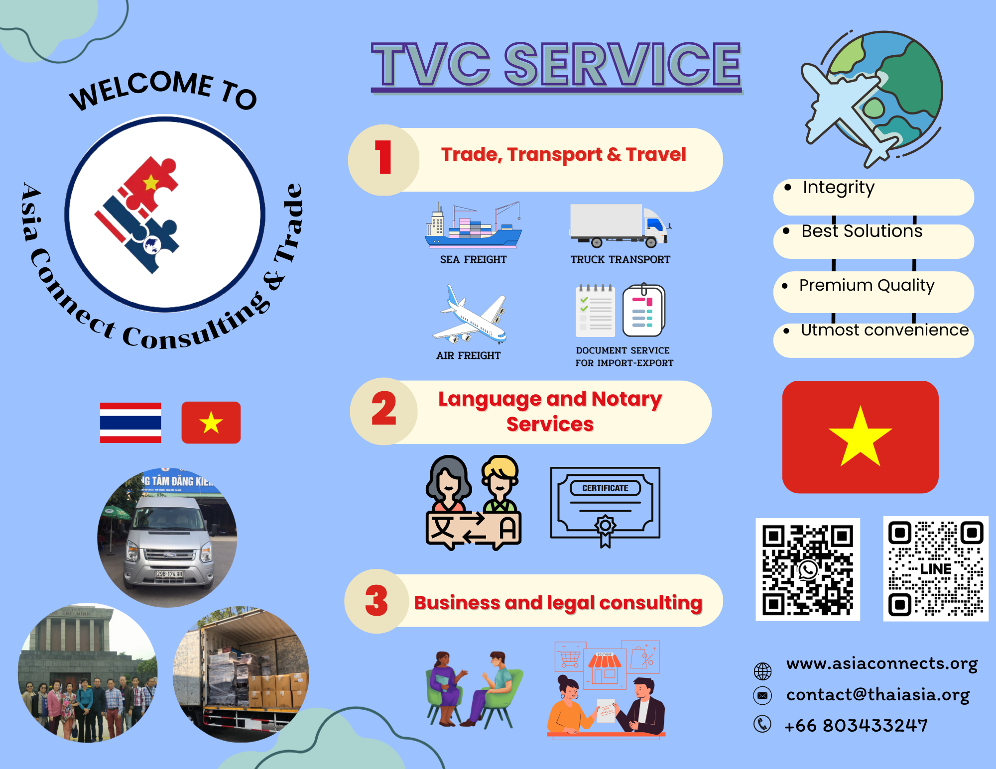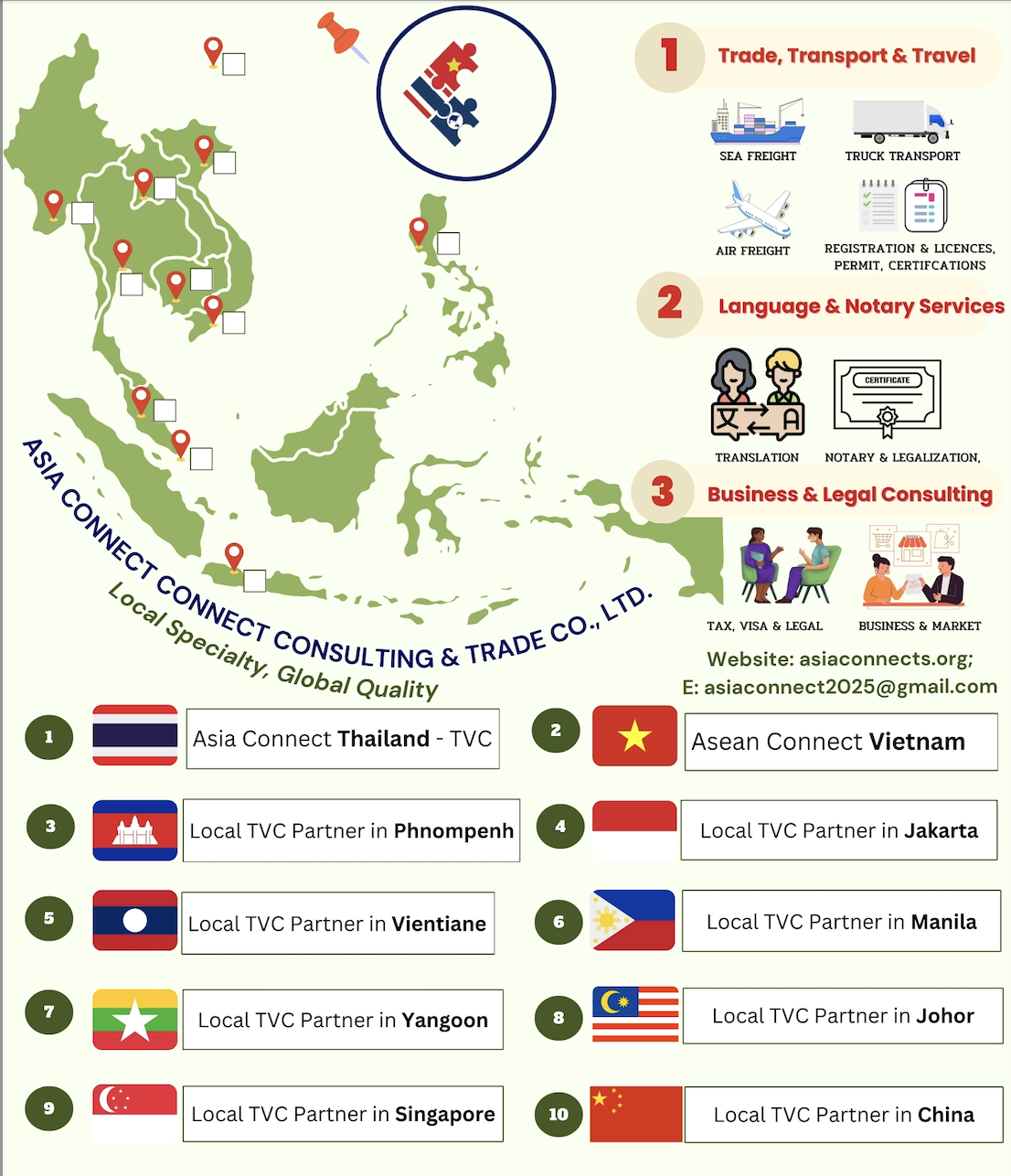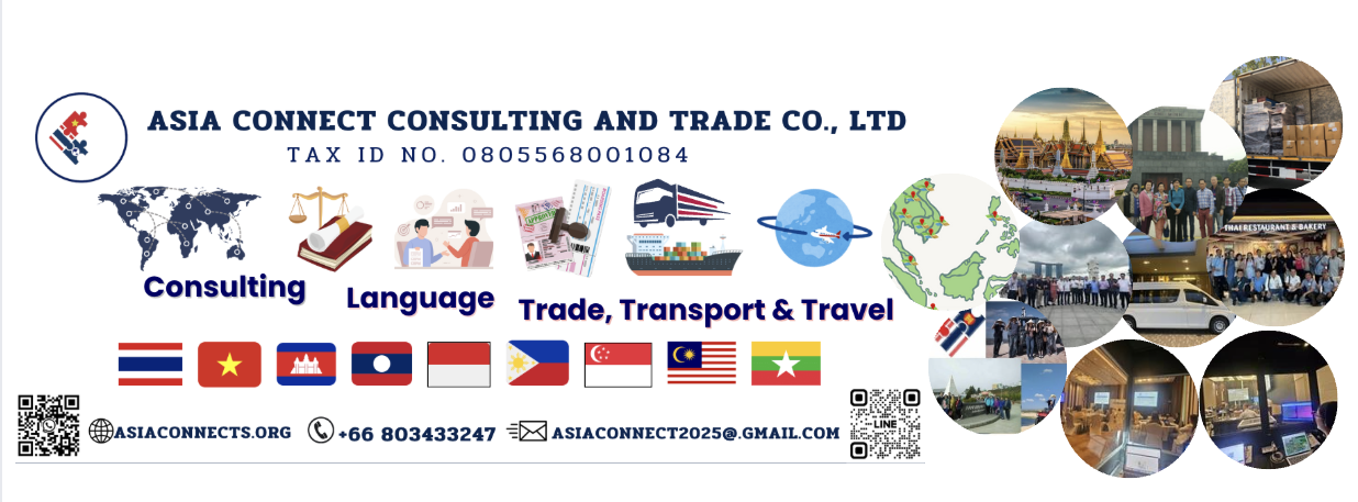 Asia Connect Consulting and Trade, Thailand (Tax ID 0805568001084 – TVC, previously known as Thai Viet Connect since 2018) is a service provider founded by a group of local experts in professional services of language, consulting, and logistics. TVC in cooperation with Asean Connect Ltd., (Tax ID: 5702045145 registered in Vietnam) and other local partners in Asia, provides 3 premium services on trade & transport, vernacular language, and consulting at reasonable prices, with utmost convenience, and the highest quality for our customers including private businesses, public agencies or organizations, and individuals in Thailand, Vietnam, and other countries, namely, Indonesia, the Philippines, Laos, Cambodia, Myanmar, Singapore, and Malaysia… in Asia.