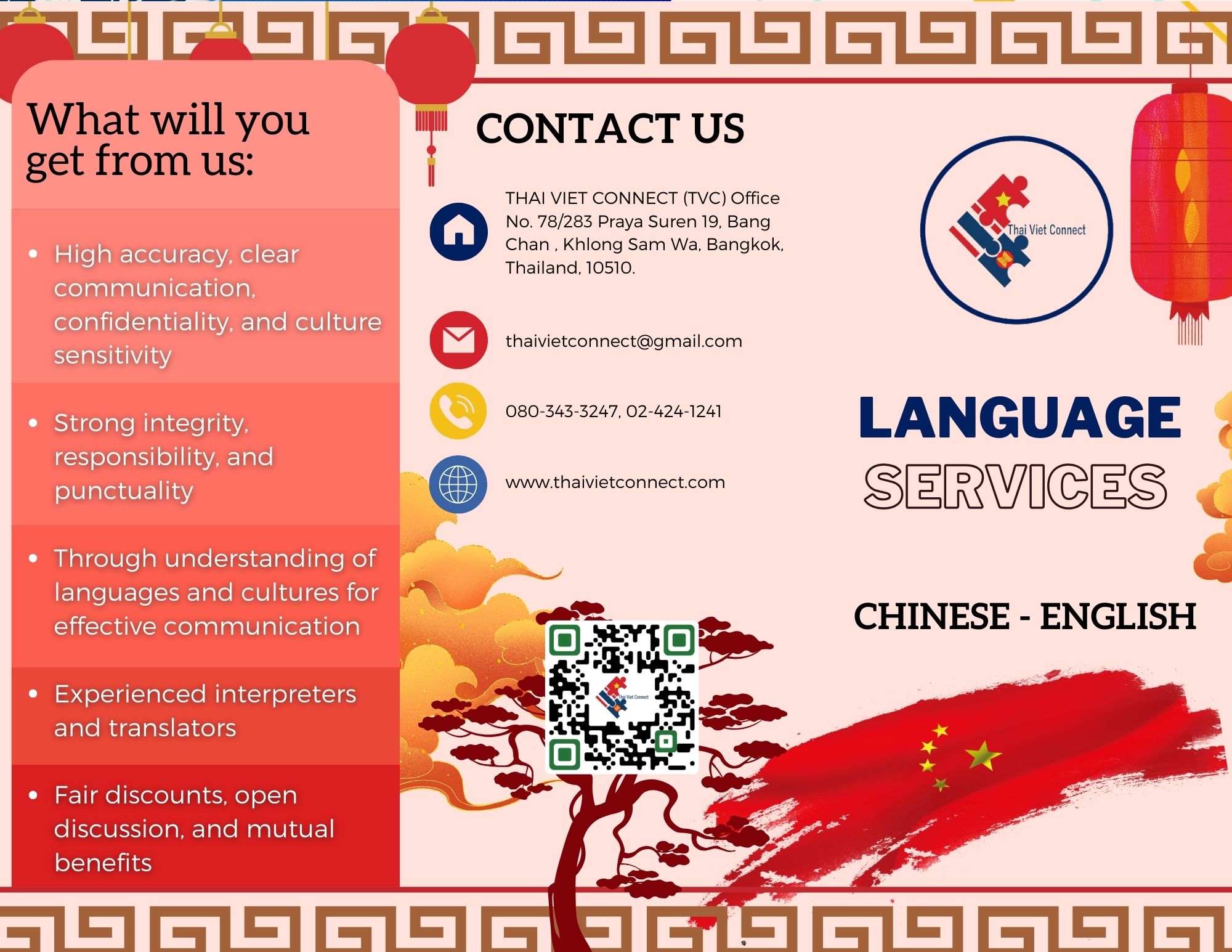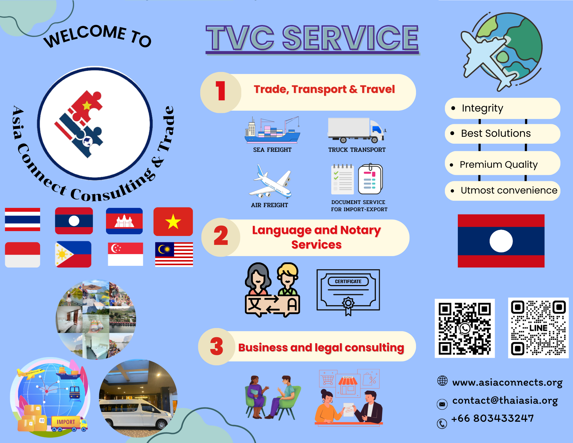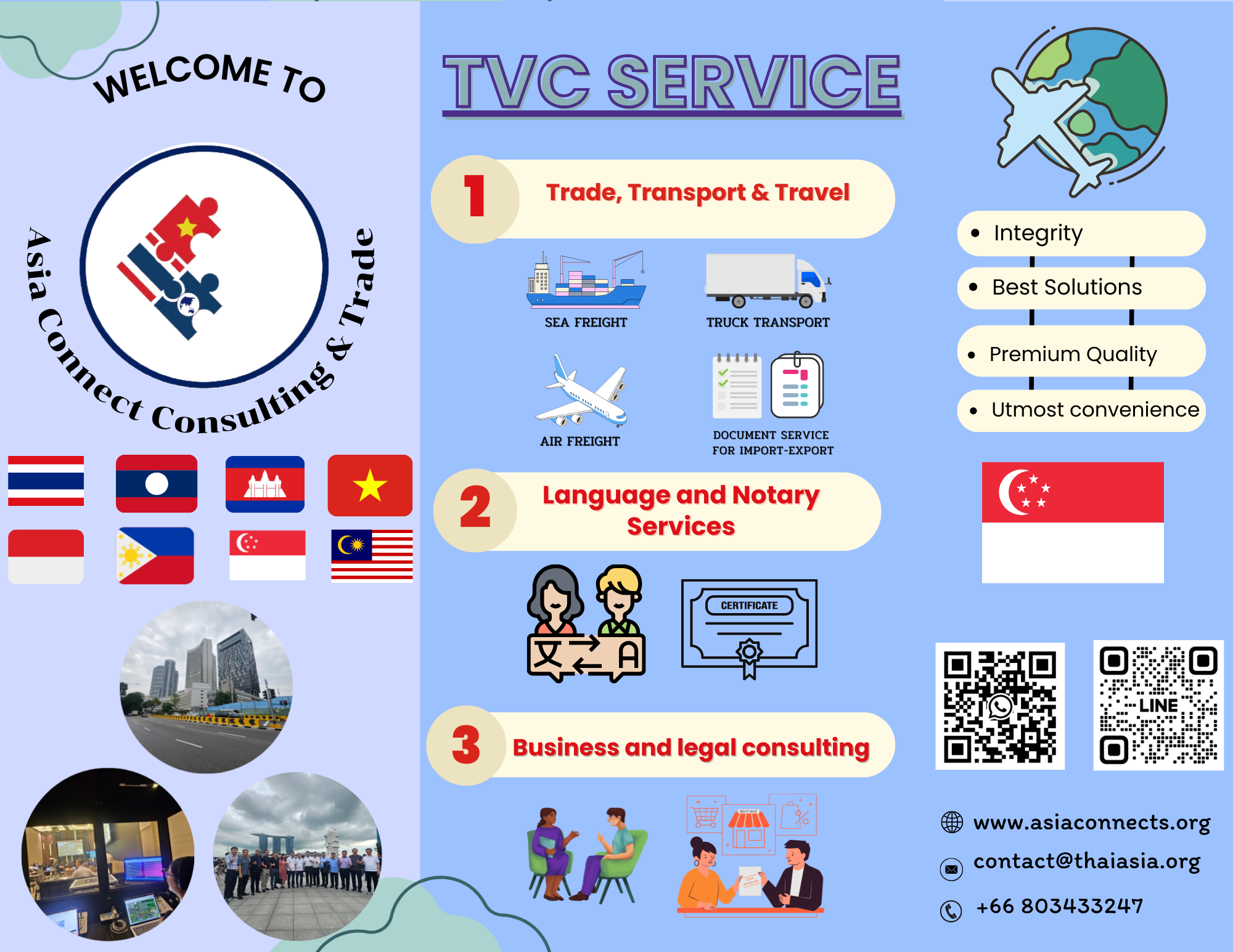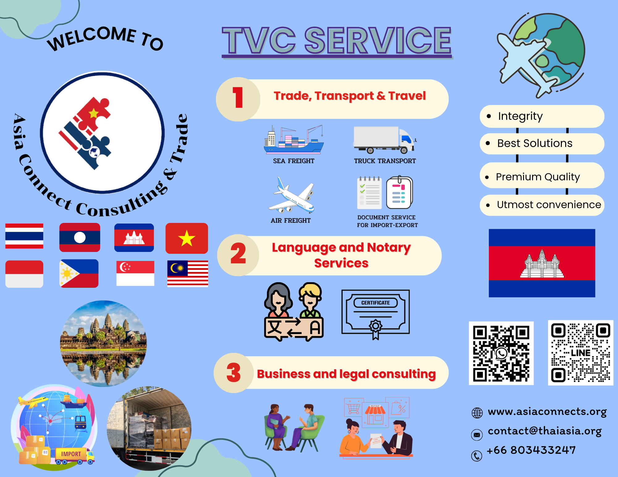 Asia Connect Consulting and Trade, Thailand (Tax ID 0805568001084 – TVC, previously known as Thai Viet Connect since 2018) is a service provider founded by a group of local experts in professional services of language, consulting, and logistics. TVC in cooperation with Asean Connect Ltd., (Tax ID: 5702045145 registered in Vietnam) and other local partners in Asia, provides 3 premium services on trade & transport, vernacular language, and consulting at reasonable prices, with utmost convenience, and the highest quality for our customers including private businesses, public agencies or organizations, and individuals in Thailand, Vietnam, and other countries, namely, Indonesia, the Philippines, Laos, Cambodia, Myanmar, Singapore, and Malaysia… in Asia.