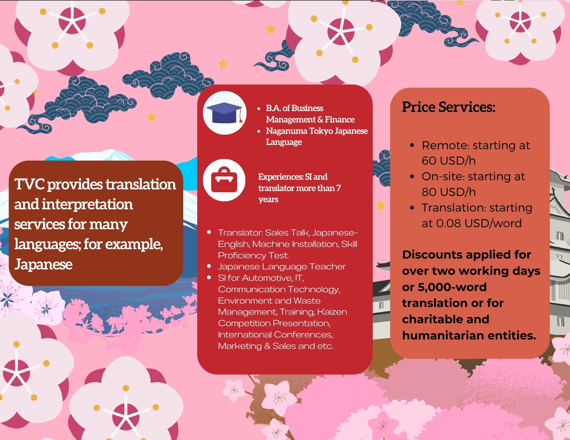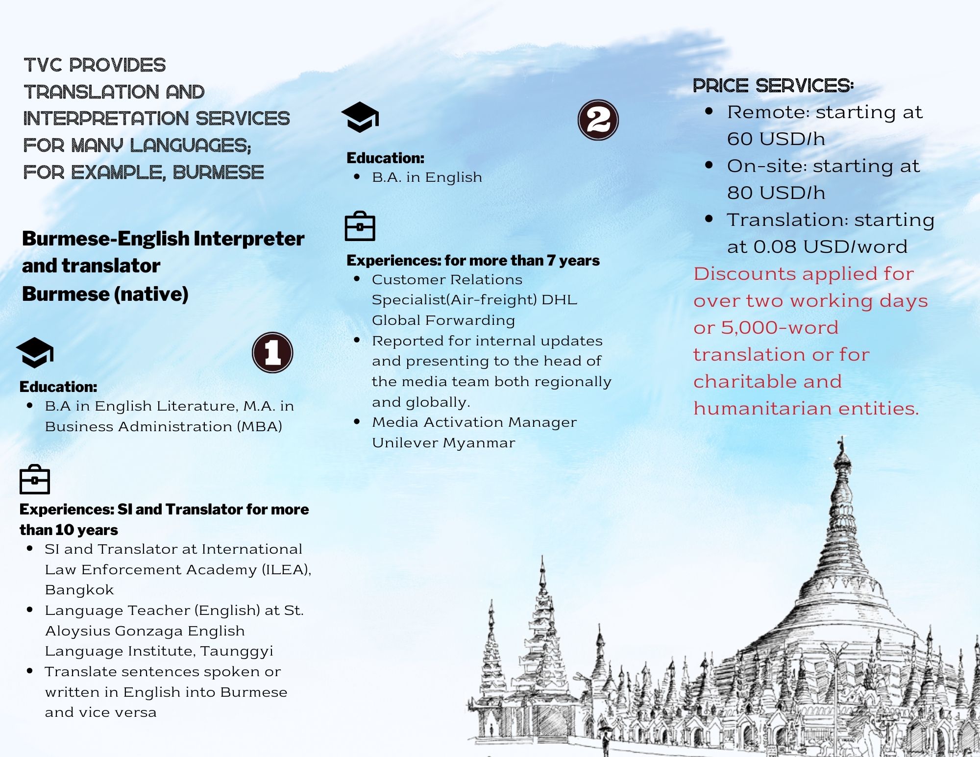 - Translation: starting at 0.08 USD/word. Discount rates for 5,000 words.