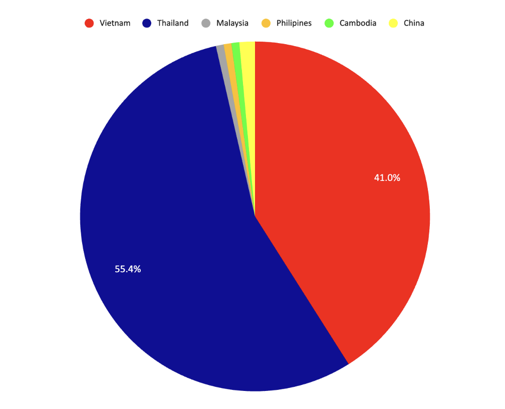 - Vietnam, Thailand, Laos, Cambodia, and Indonesia