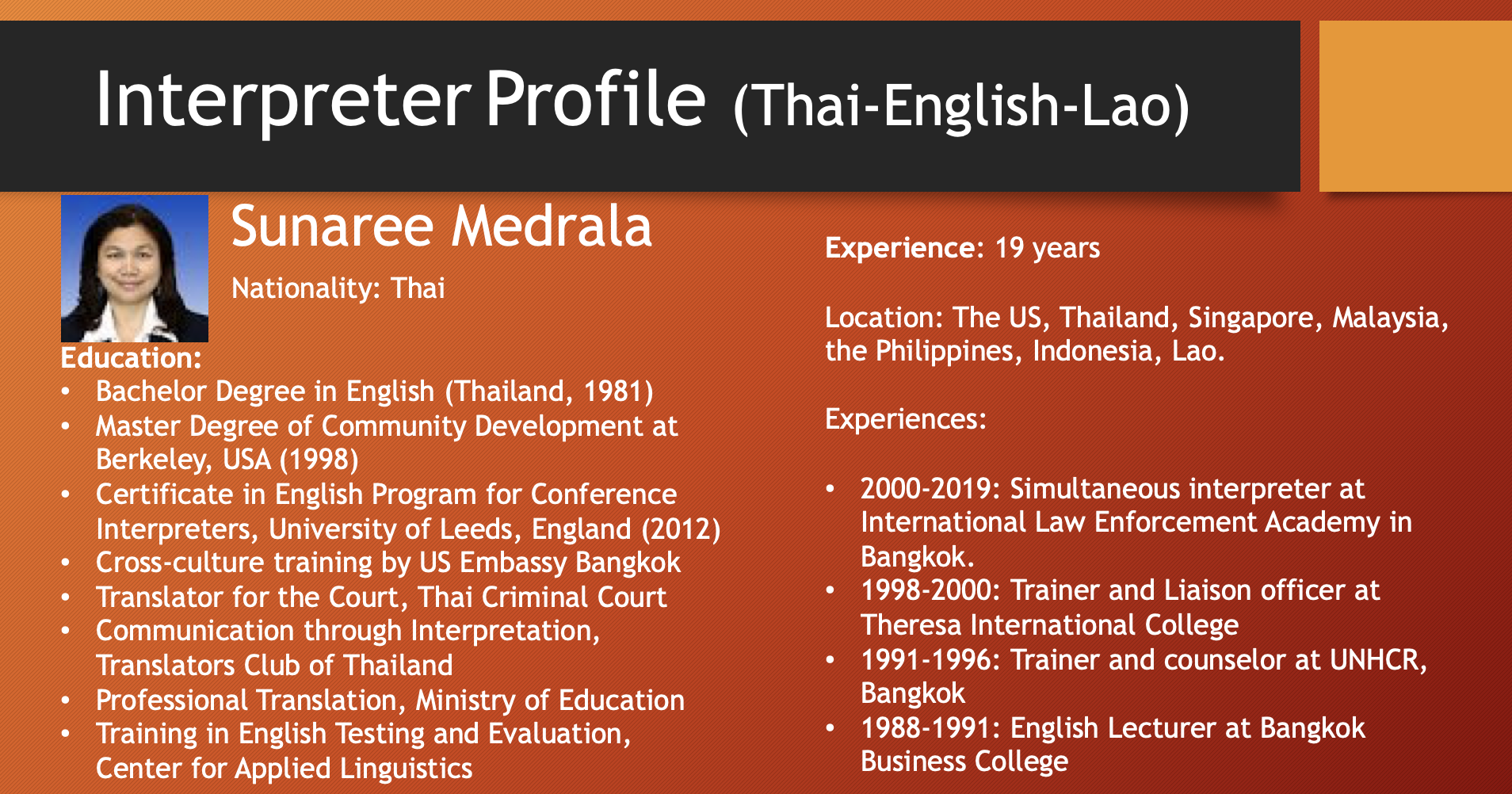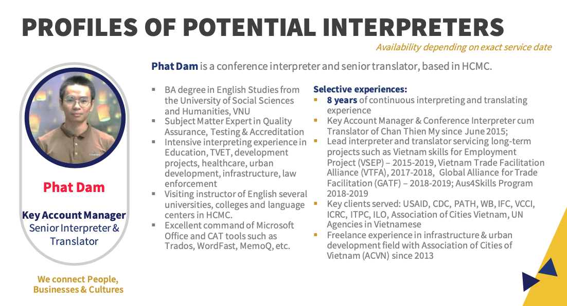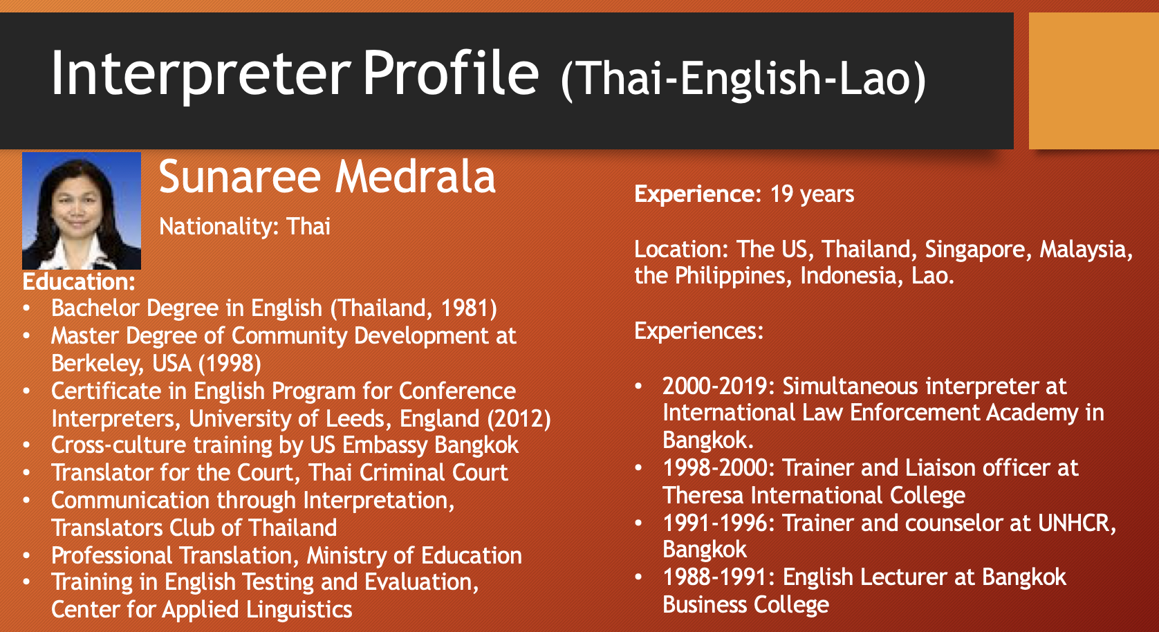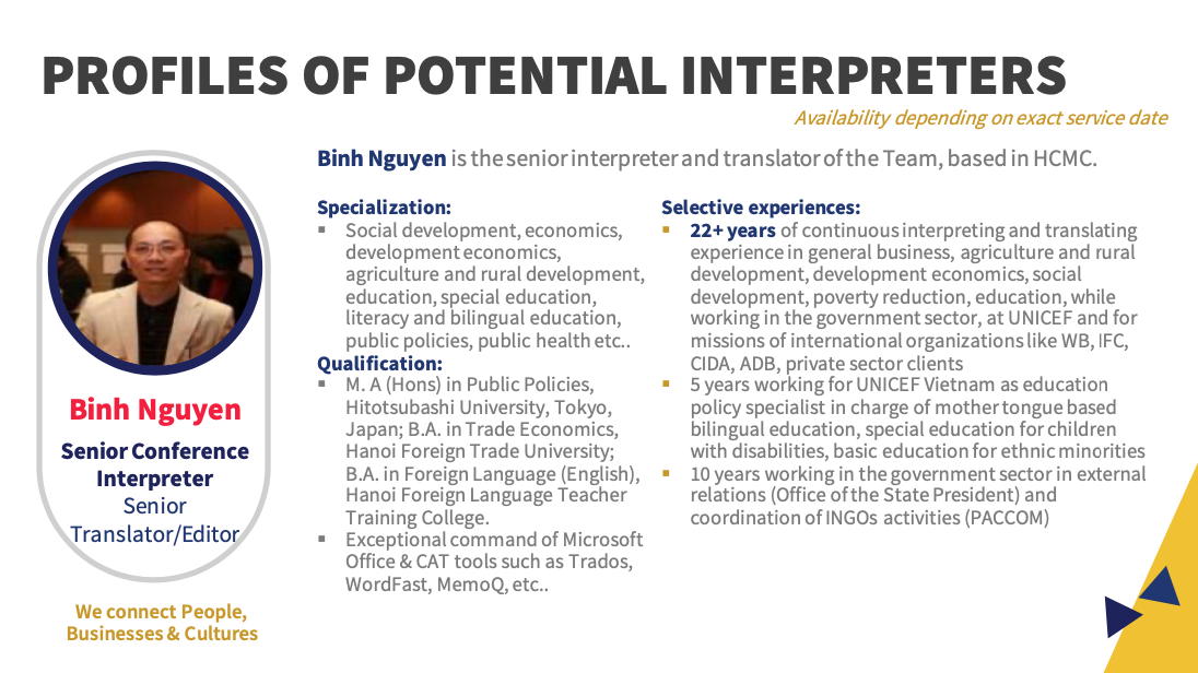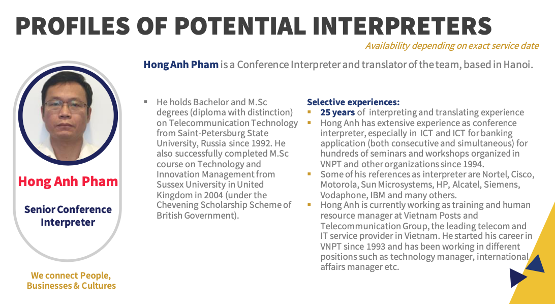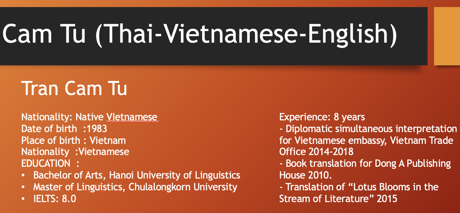 เอเชียคอนเนคต์ คอนซัลติ้ง แอนด์ เทรด (0805568001084) เป็นผู้ให้บริการภาษาในเวลายาวนาน พร้อมล่ามภาษาเป็นเจ้าของภาษาที่มีคุณภาพจากหลากหลายประเทศดังต่อไปนี้