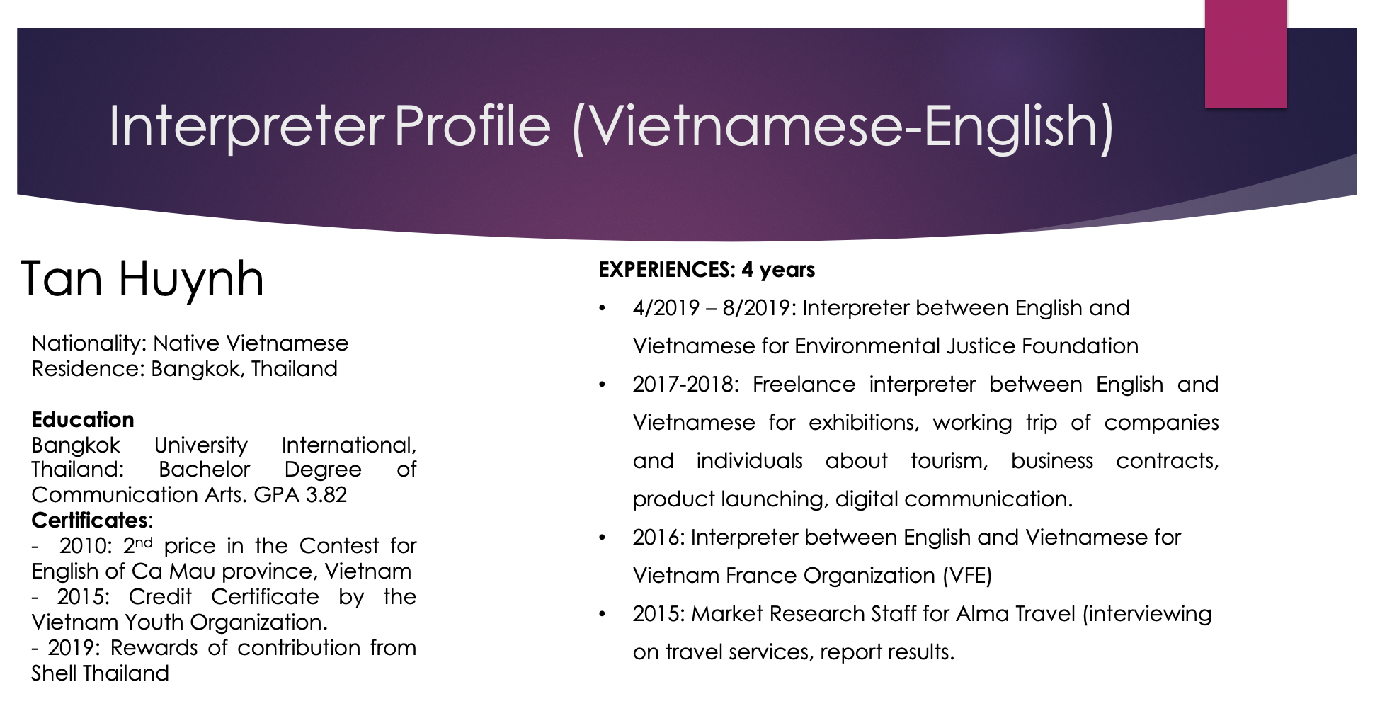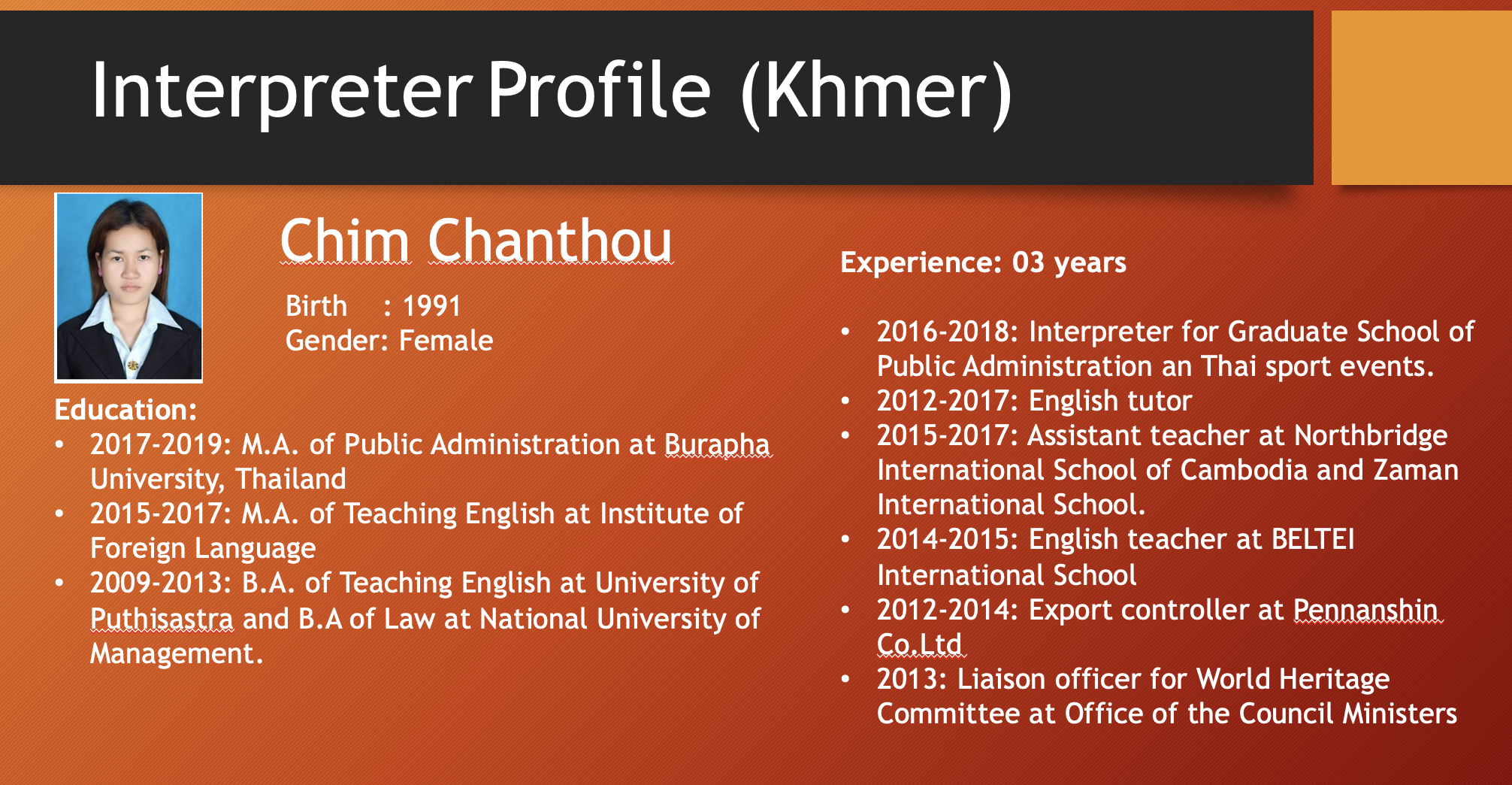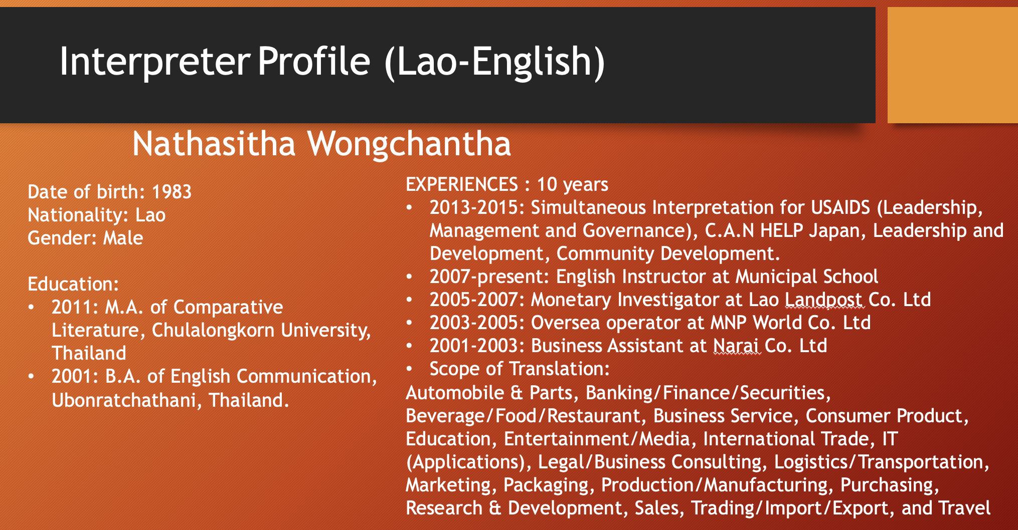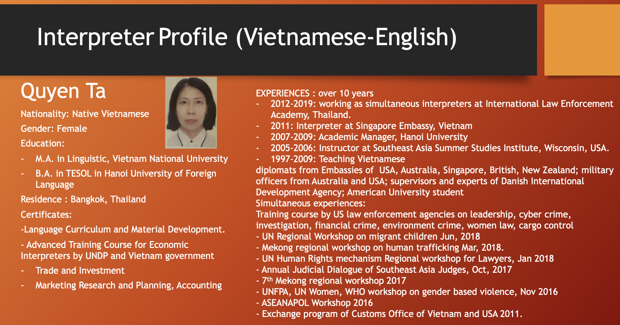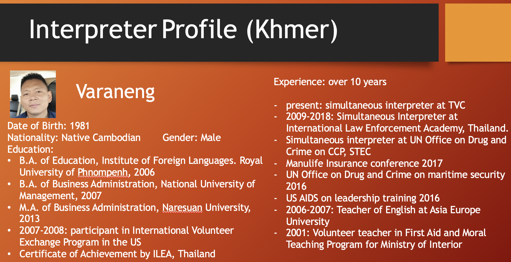 เอเชียคอนเนคต์ คอนซัลติ้ง แอนด์ เทรด (0805568001084) เป็นผู้ให้บริการภาษาในเวลายาวนาน พร้อมล่ามภาษาเป็นเจ้าของภาษาที่มีคุณภาพจากหลากหลายประเทศดังต่อไปนี้