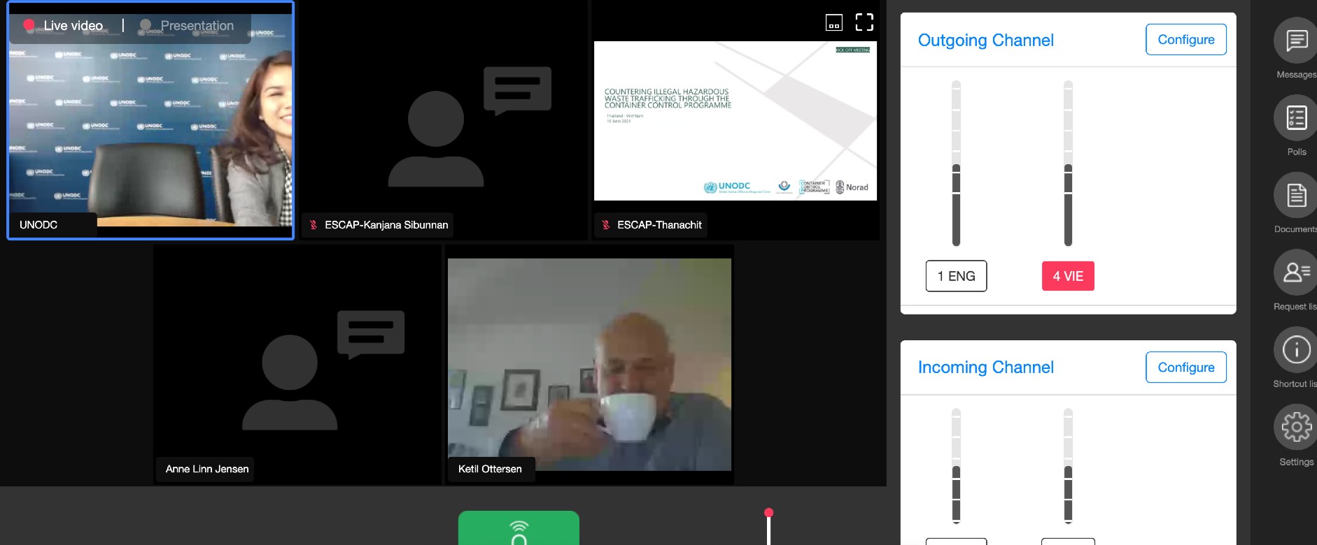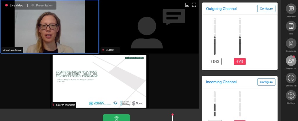 UNODC Online Workshop on Countering Illegal Hazardous Waste Trafficking through the Container Control Programme In June, 2021. Thai Viet Connect in cooperation with Sapiens Thailand provides remote simultaneous interpretation service for UNODC online workshop on custom control and the implementation of Countering Illegal Hazardous Waste Trafficking through the Container Control Programme to Vietnamese delegations including PCU units from Hai Phong city, Vung Tau, the anti-smuggling department, international cooperation office, UNODC Vietnam and UNODC Thailand, General Department of Customs and Excise of Cambodia, Royal Malaysian Customs Department, Bureau of Customs of the Phillipines, Thai Customs Department, General Department of Vietnam Customs.