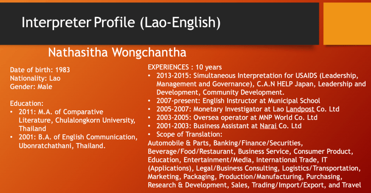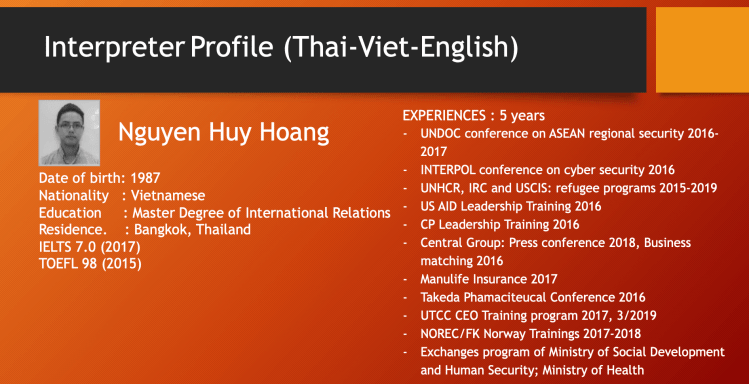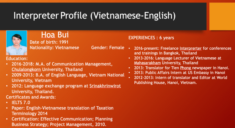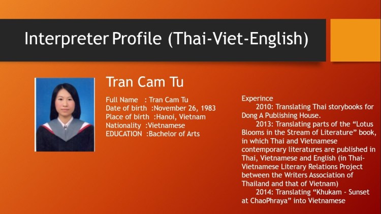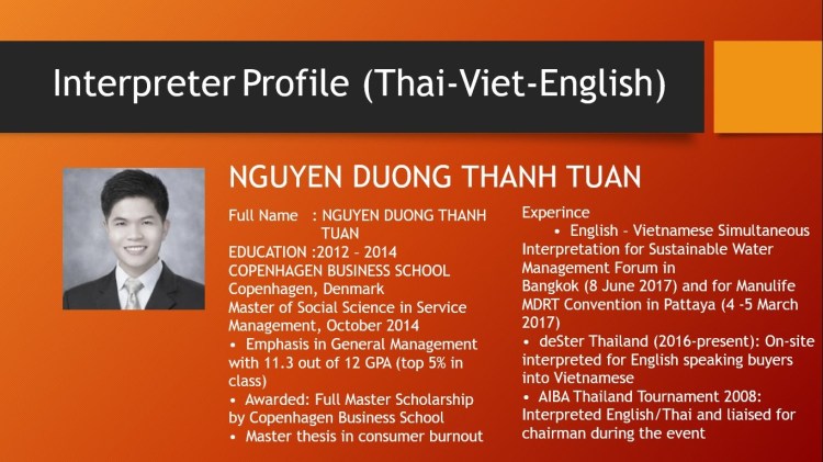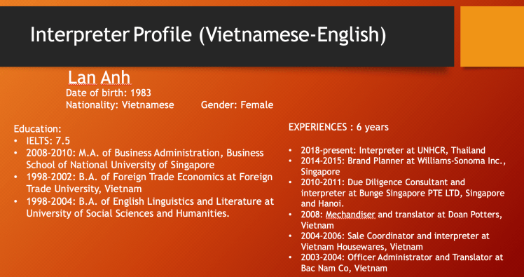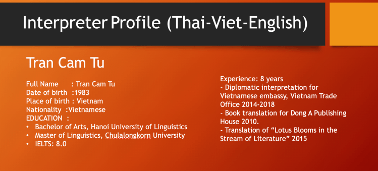 TVC Interpreter profiles Posted byHoangJune 24, 2021November 2, 2021Posted inServices Share this: Share on Facebook (Opens in new window) Facebook Share on WhatsApp (Opens in new window) WhatsApp Share on X (Opens in new window) X Email a link to a friend (Opens in new window) Email Print (Opens in new window) Print More Share on LinkedIn (Opens in new window) LinkedIn Like Loading...