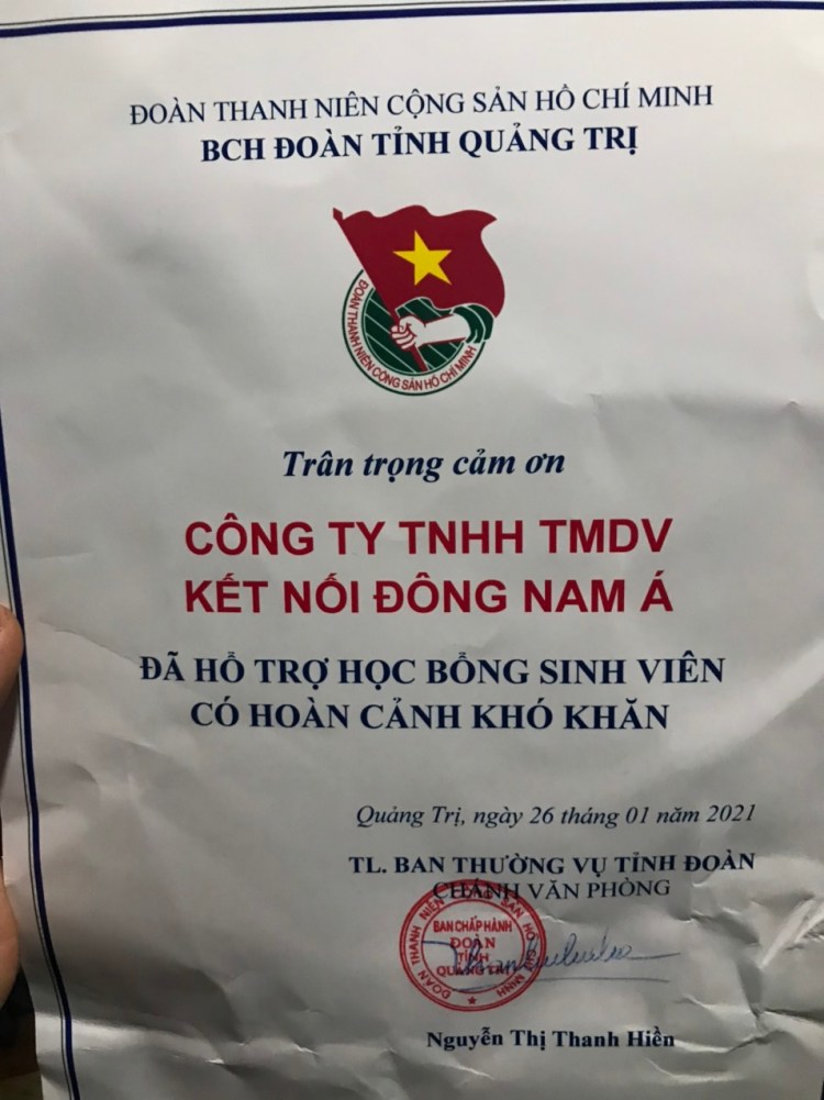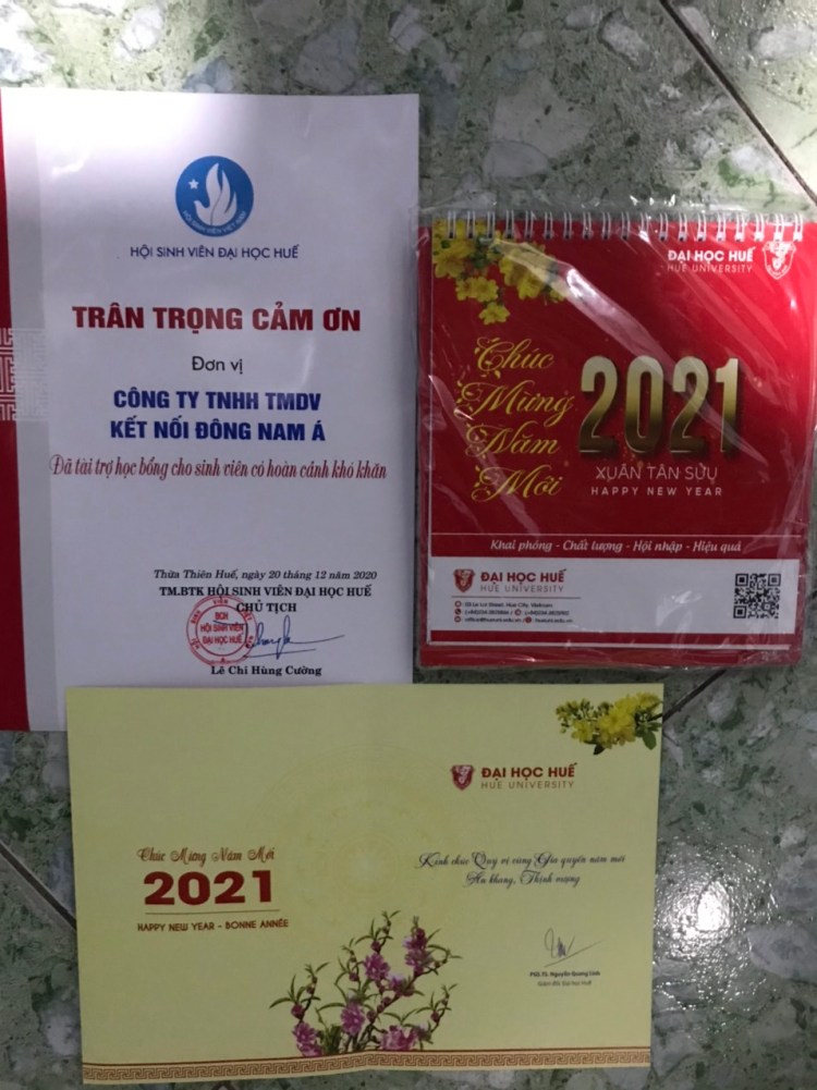 TVC Thailand and ASEAN CONNECT Co., Ltd., Vietnam, granted scholarships to students at Hue University and Quang Tri University for their achievements and for mitigating flood impacts on their families in December 2020.