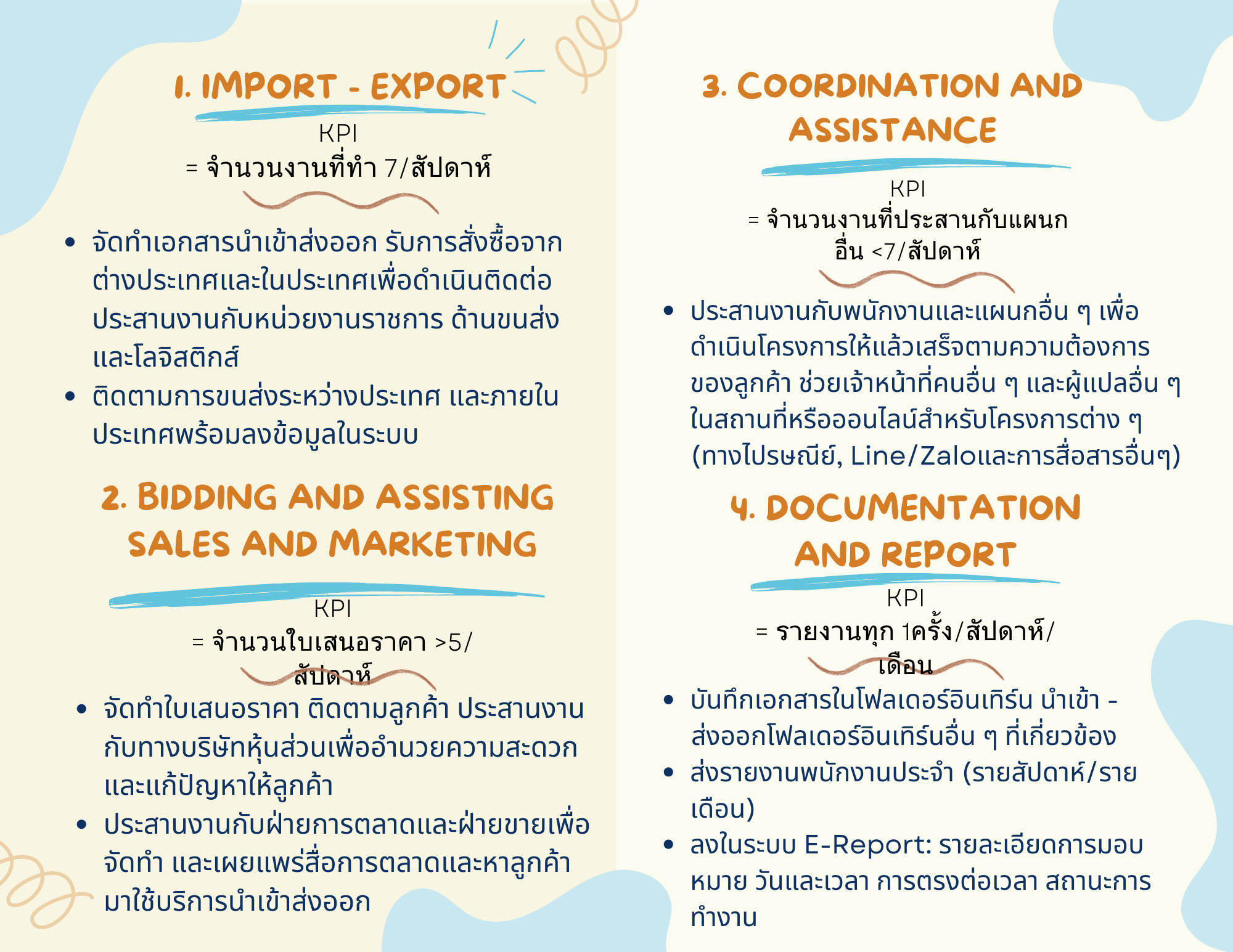 - ประสานงานเรื่องการนำเข้าและส่งออก และจัดทำเอกสารด้านนำเข้า-ส่งออก จัดทำใบเสนอราคา รับคำสั่งซื้อจากลูกค้าต่างประเทศ รวบรวมข้อมูลการสั่งซื้อ และประสานงานกับแผนกอื่นๆที่
