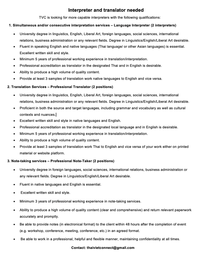 - ดำเนินการแปลภาษา ทั้งในรูปแบบเอกสาร แปลประกบตัว แลแปลในตู้ผ่านระบบ SI